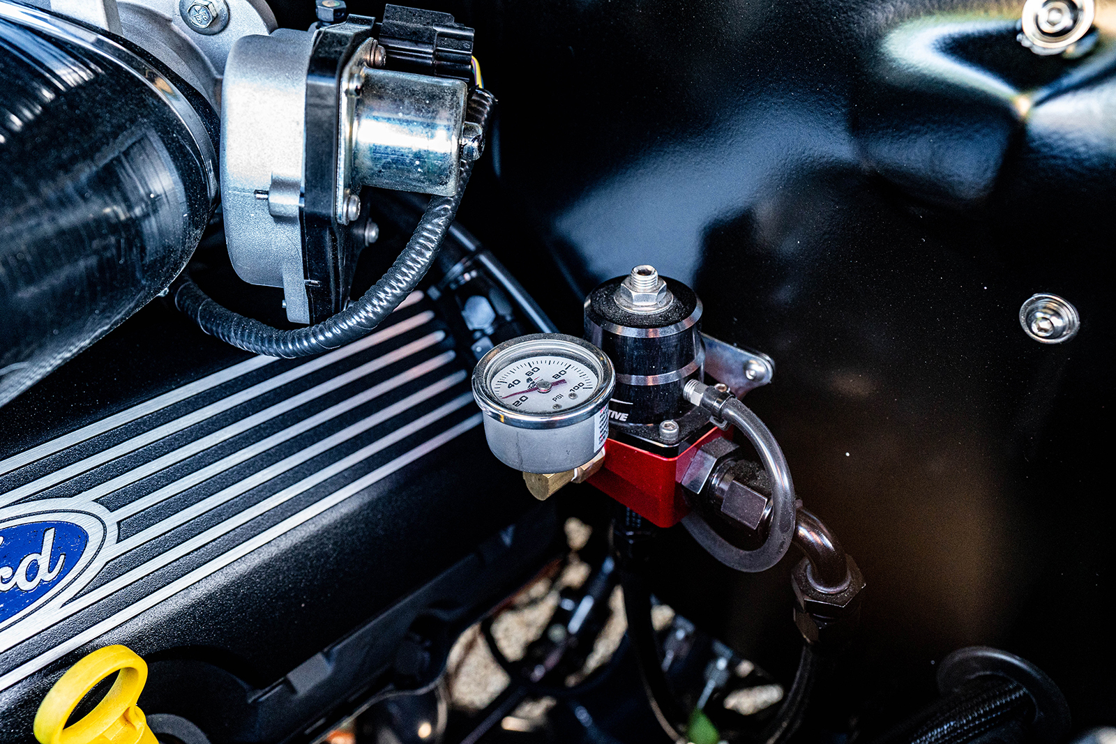 The Baer Pro+ 14-inch drilled-and-slotted rotors, coupled with six-piston calipers at the corners, bring this potent surf wagon to a halt. The brake system is worked by a Raybestos Corvette 1-inch bore master cylinder, which features a custom under dash-mounted pedal assembly that also handles the clutch chores. More corner appeal is the Schwartz front spindles and the rear 3/4-inch sway bar. Couple all this with the black-painted Coker steelies with chrome “Ford” block letter caps that measure 20×9 and 20×10 and are mounted with 255/30Rx20 and 285/25Rx20 Continental tires.