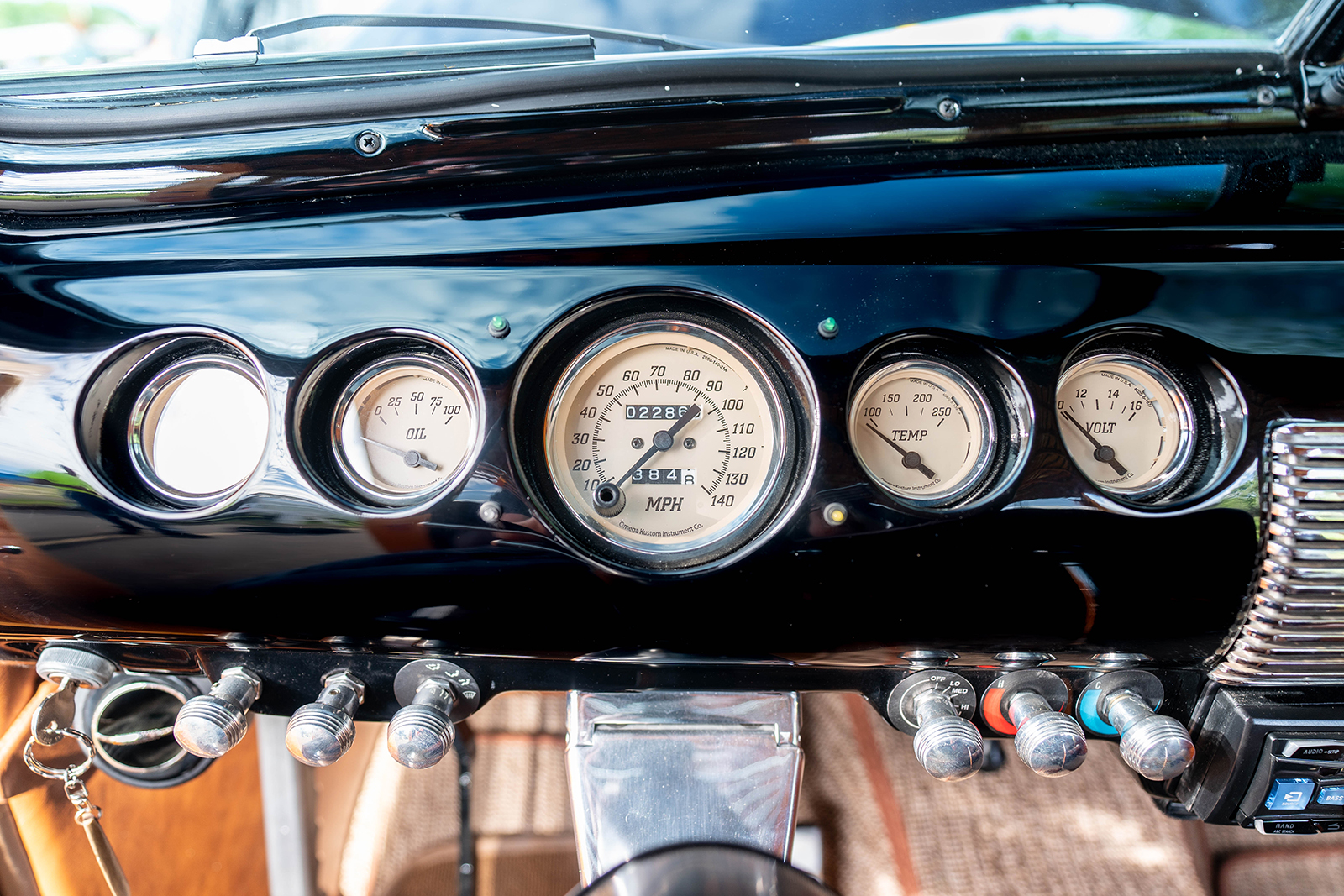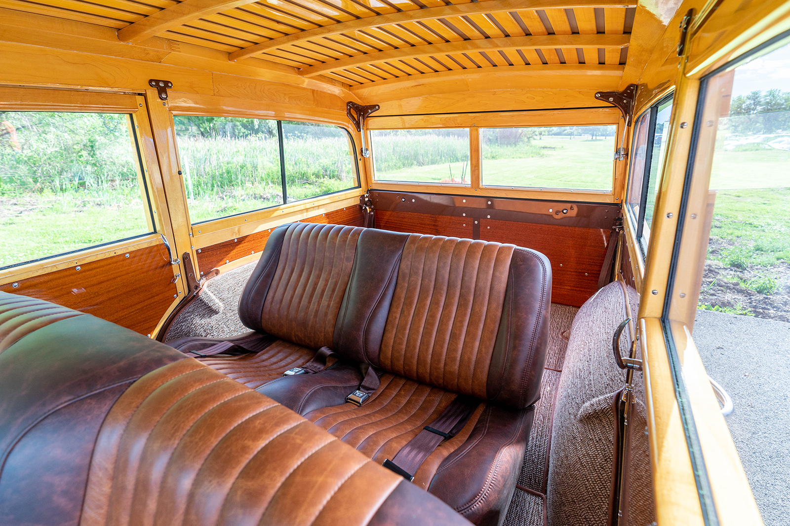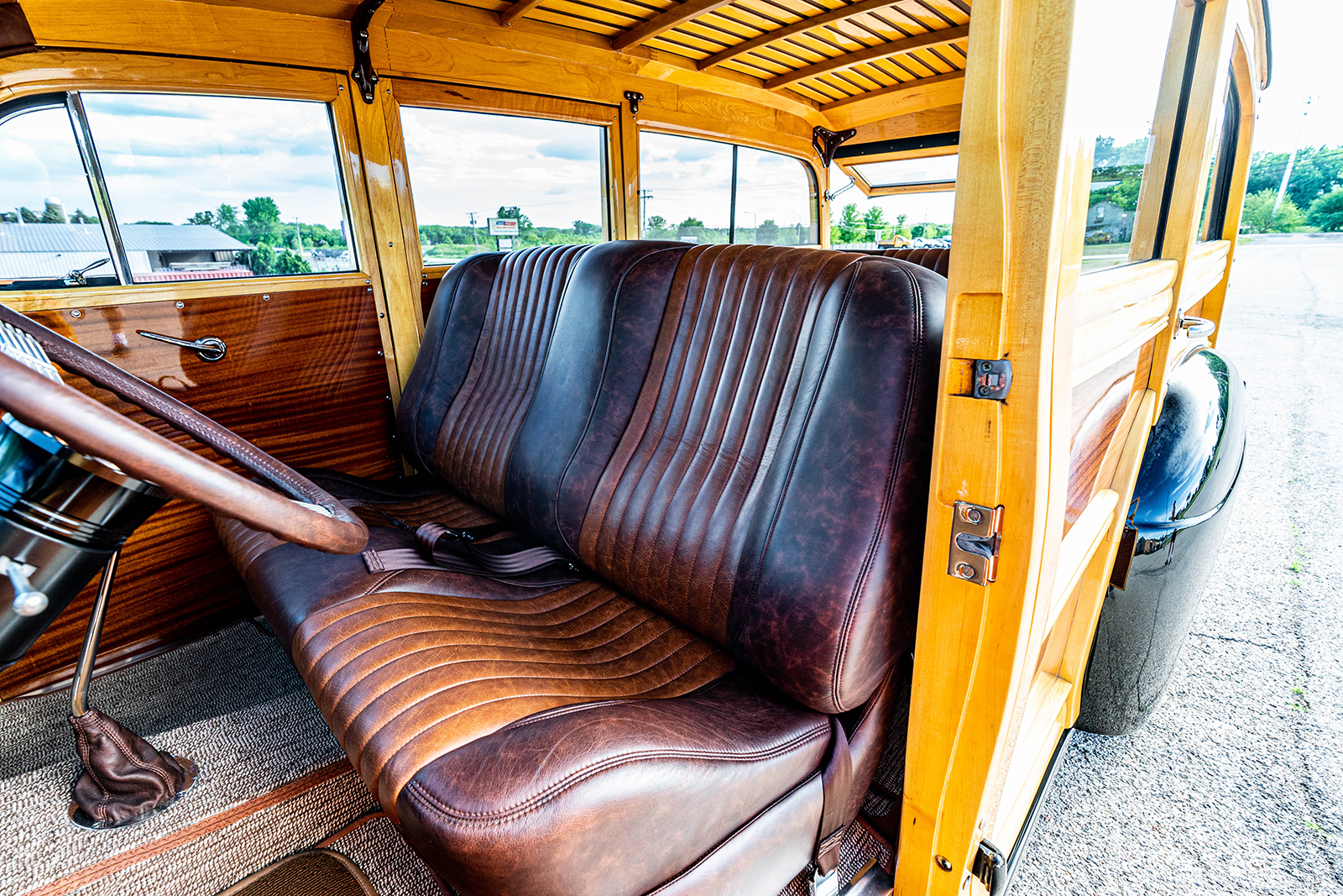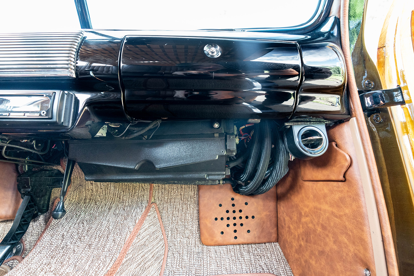 Inside the factory, the dash is outfitted with Classic Instruments gauges and Vintage Air AC (switches are mounted within a sub dash panel with registers mounted just below). At the same time, an American Autowire harness was poisoned at Schwartz Performance to bring these and the aftermarket stereo to life. Also visible is the Flaming River steering column, topped with a custom leather-wrapped banjo wheel. The factory bench seating is stitched in distressed brown leather by Cassin Customizing with lap belts from Seat Belt Planet.
