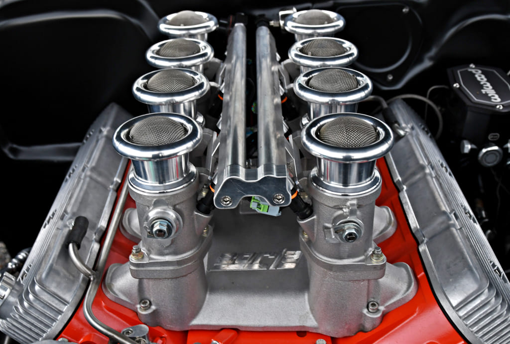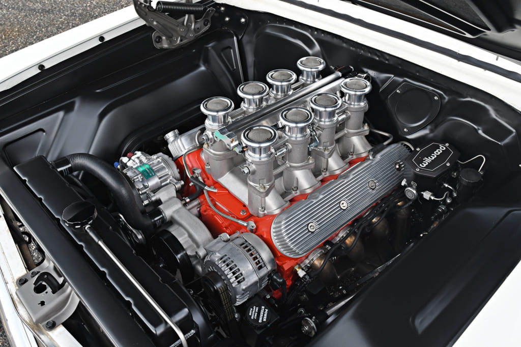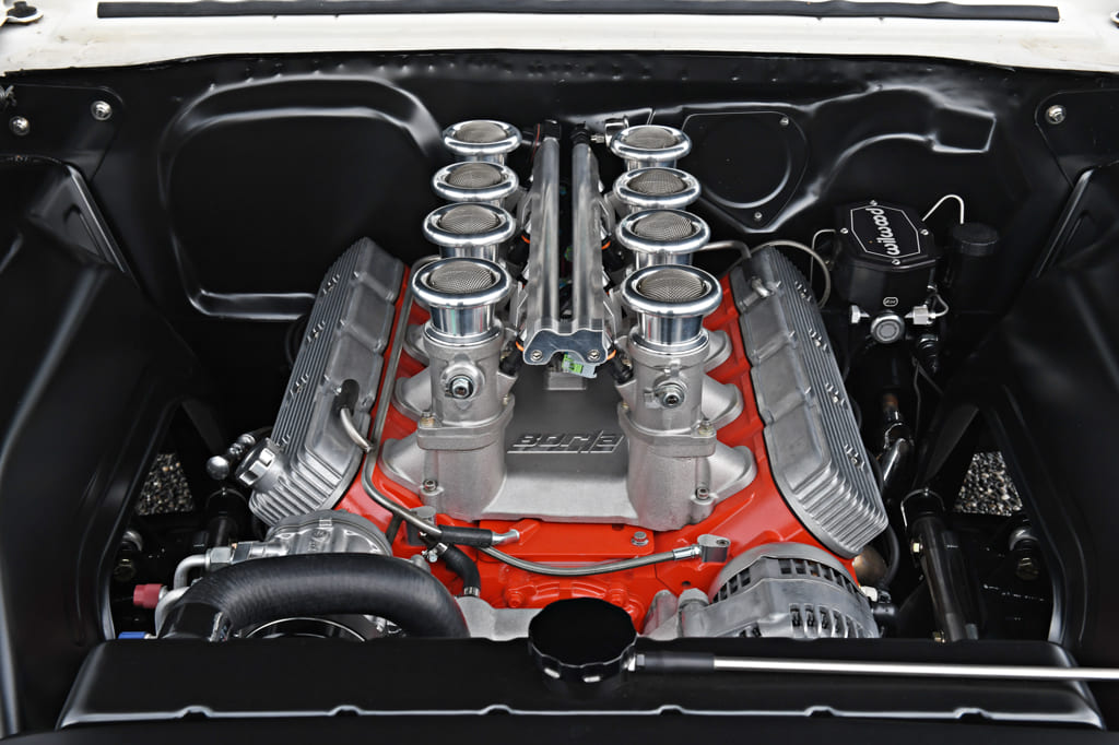 12 Front view of the 1966 Chevrolet Nova’s engine highlighting the intake stacks