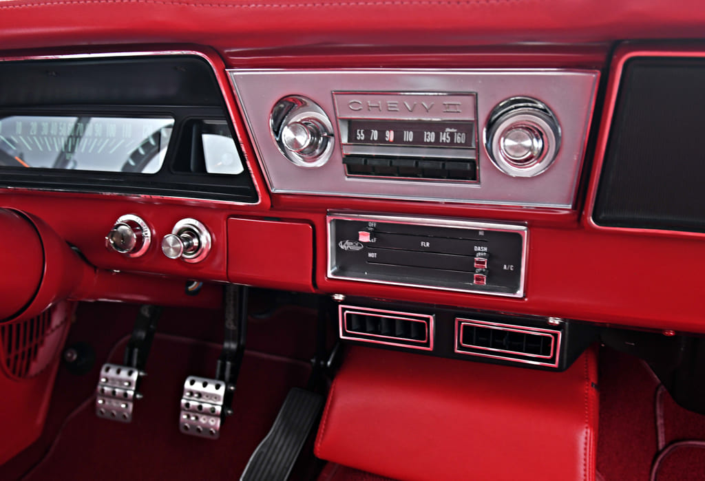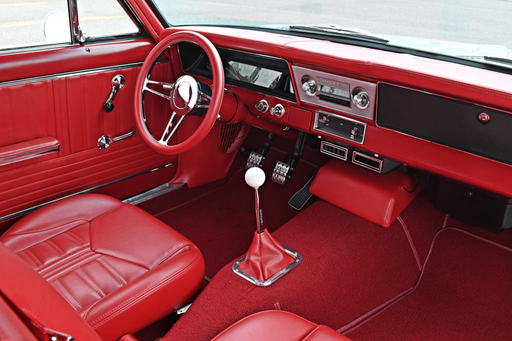 13 Red interior of the 1966 Chevrolet Nova with custom seats and a sleek dashboard