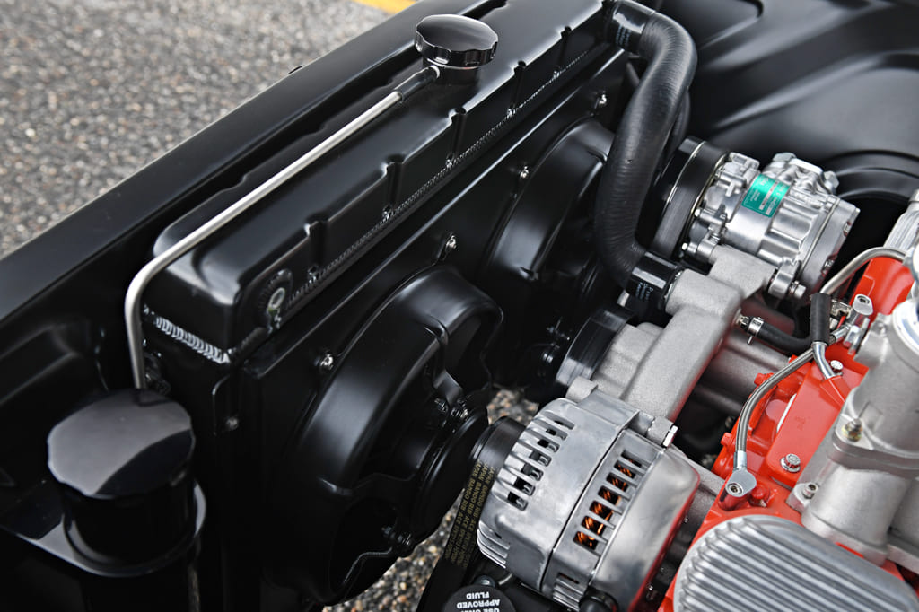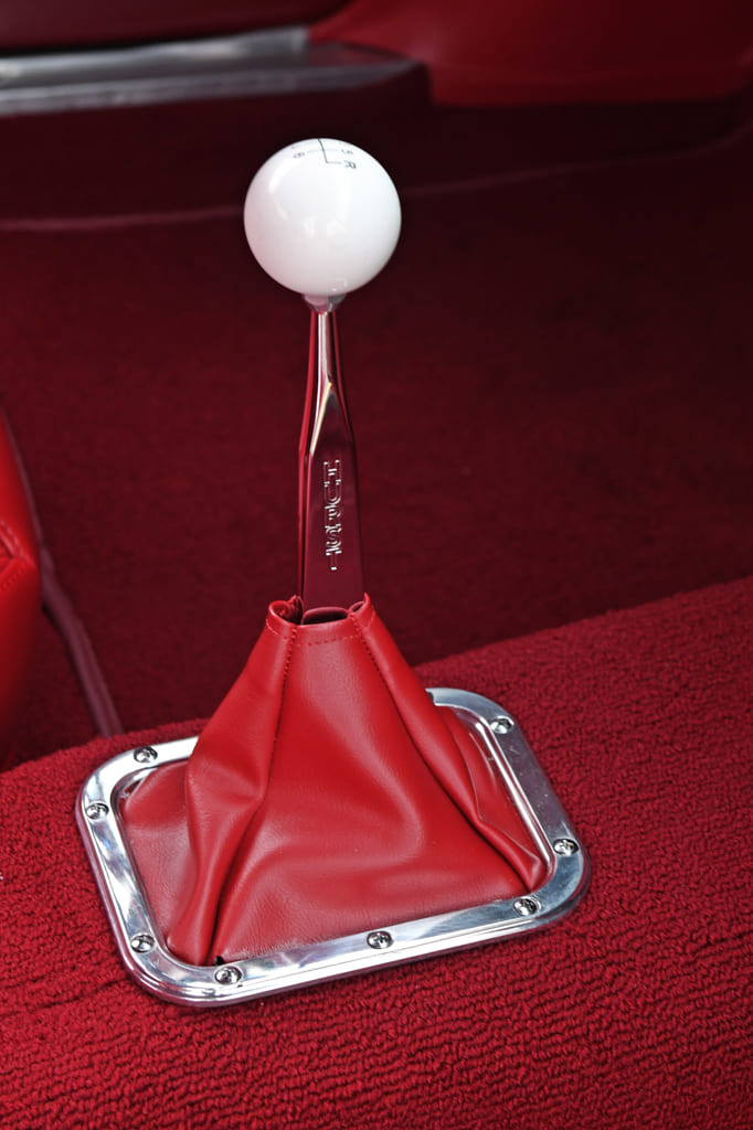 The interior was redone in TMI’s red vinyl interior kit. Seats are Pro Classic Sport SS low-back seats in 957 red with matching door panels and dashpad. A GT steering wheel spins on an ididit tilt column to keep this ride pointed in the right direction. A custom-fabricated crossbar serves as the mounting point for seatbelts and shoulder harnesses sourced from Seatbelt Planet. A Dakota Digital RTX gauge cluster gives a modern look while keeping track of the always-important engine vitals.