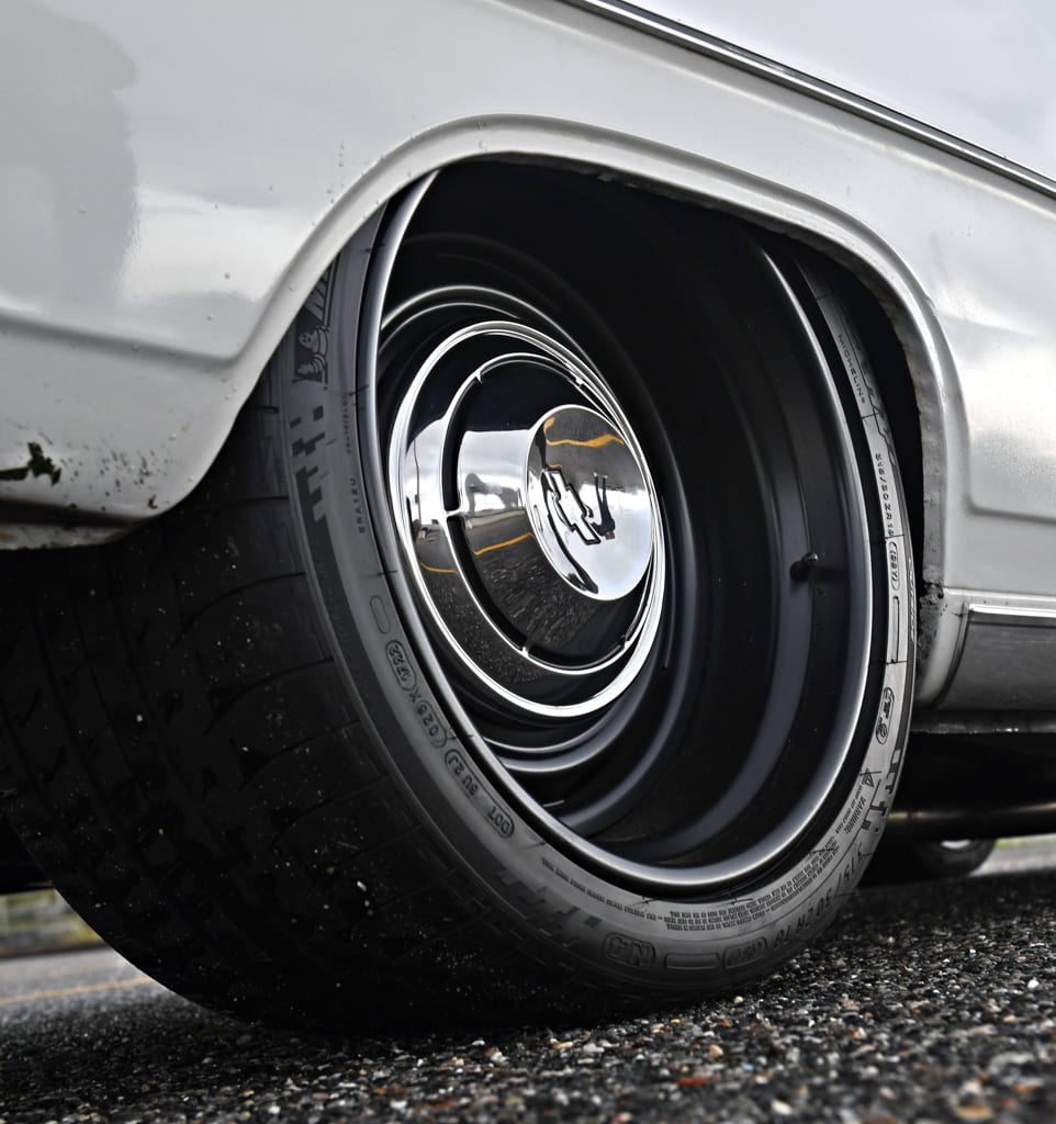 16 Low angle shot of the 1966 Chevrolet Nova’s chrome wheel and black steel rim