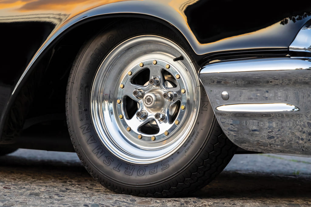 An Art Morrison Enterprises (AME) chassis armed with a rear ladder bar suspension includes QA1 coilover shocks and springs to get all that muscle to the ground. An AME Street Strut suspension with tubular control arms up front utilizes a 1-inch sway bar and QA1 coilover shocks and springs to achieve the proper stance while introducing the ’57 to driveability unachievable with the straight-axle suspension it came with.