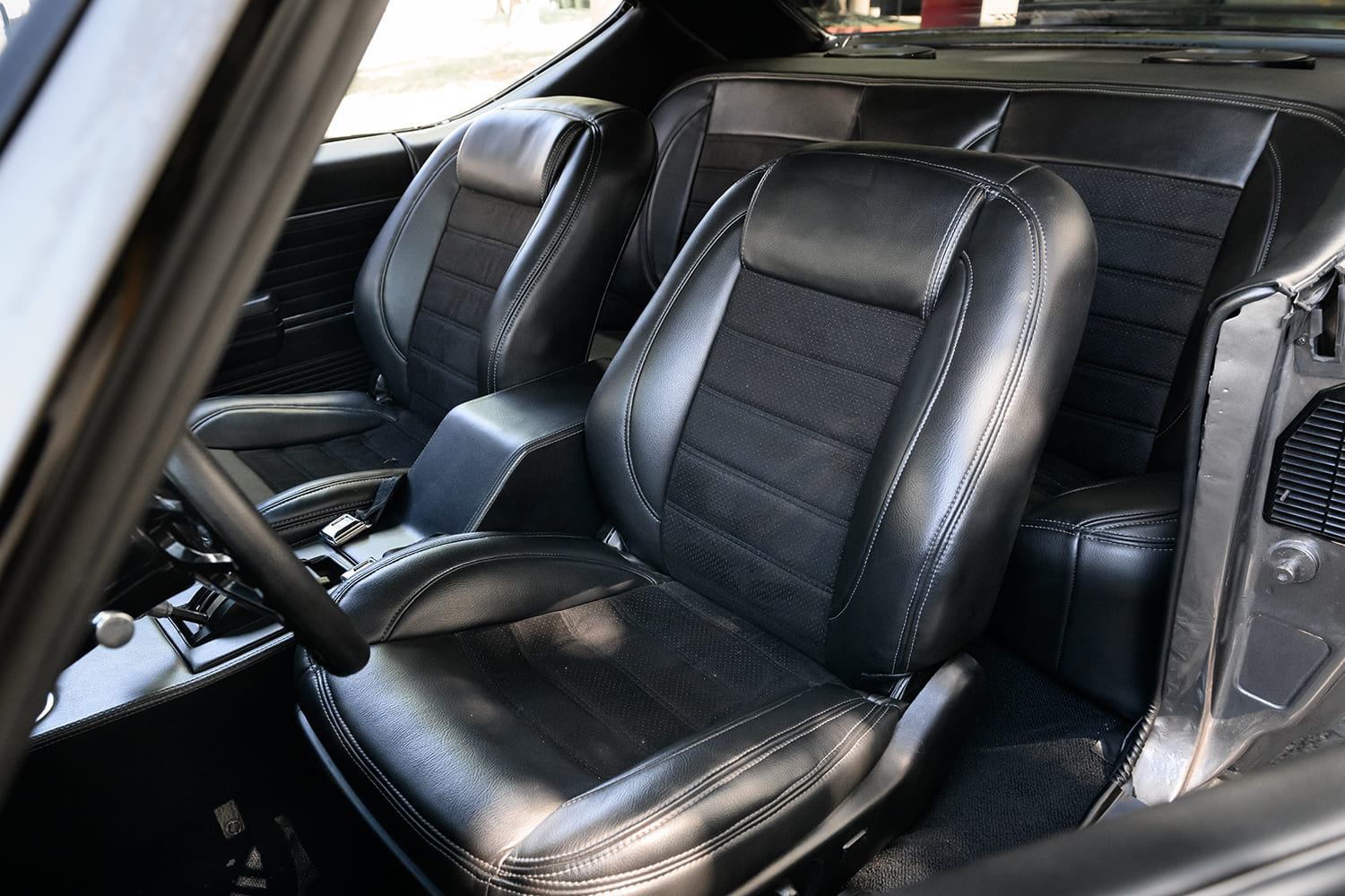 Bous Performance 12-inch rotors and four-piston calipers provide confident braking. The car rolls on a staggered set of American Racing VN514 wheels—20×8.5 up front and 20×10 out back—all wrapped in sticky Nitto tires that offer a perfect balance between grip and style.