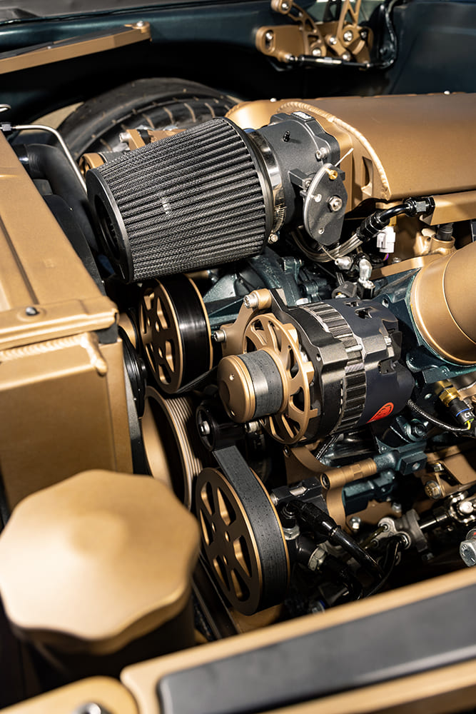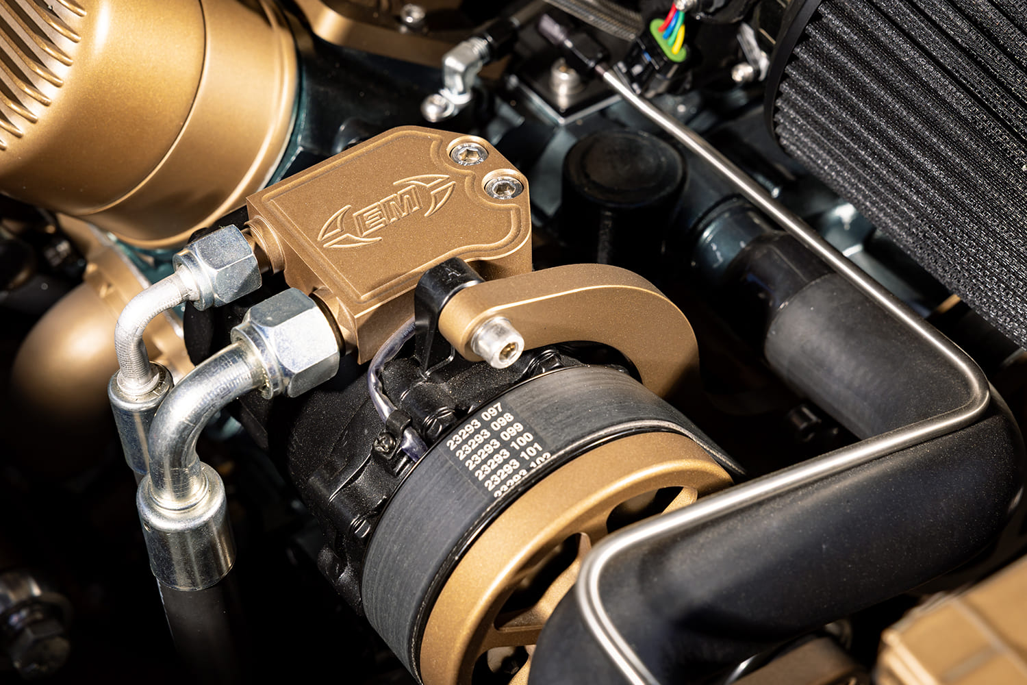Dress Up: EMS LS two-piece valve covers with coil covers, EMS LS Chevy billet aluminum S-Drive Plus, eight-rib, Pro Touring pulley kit with Cerakote finish, EMS billet aluminum hood hinges and new trunk hinges