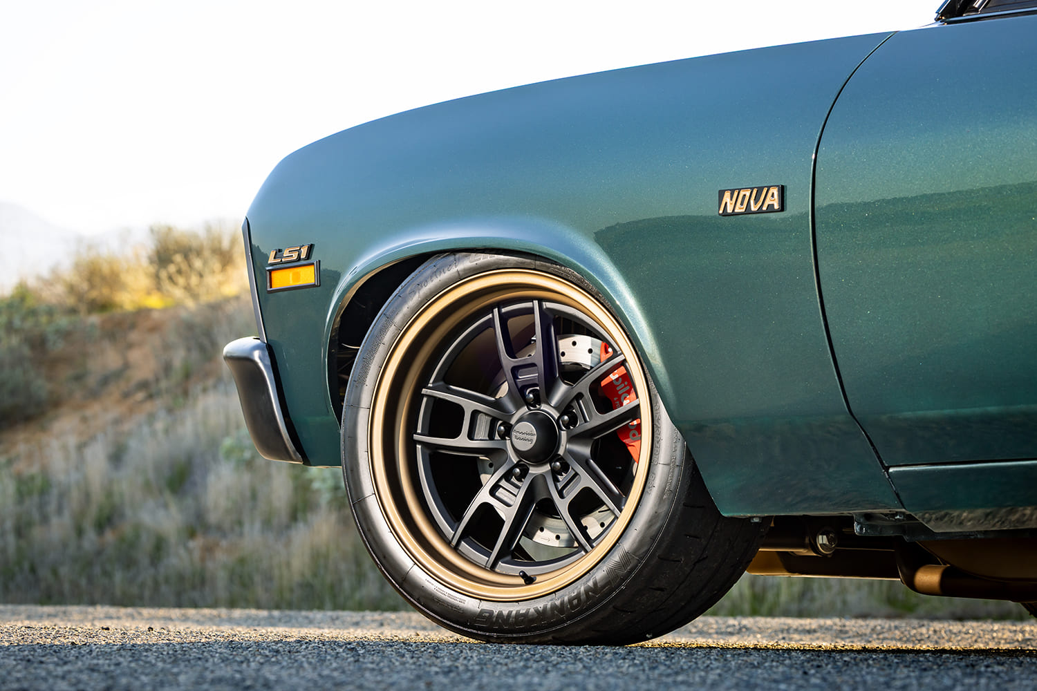 A solid build starts on a solid platform, and there’s a lot going on with this Nova. The suspension is made from a combination of Heidts and QA1 components, with Wilwood brakes and 18-inch American Racing wheels on each corner. Those wheels would also set the scene for the rest of the car because it’s not often you find a Nova with 13-inch-wide rims on all four corners. That meant modifying the rear inner fenders and installing new mini-tubs from Detroit Speed & Engineering. Up front they removed the fenderwells entirely to show off that clean suspension. Well, that and the engine.