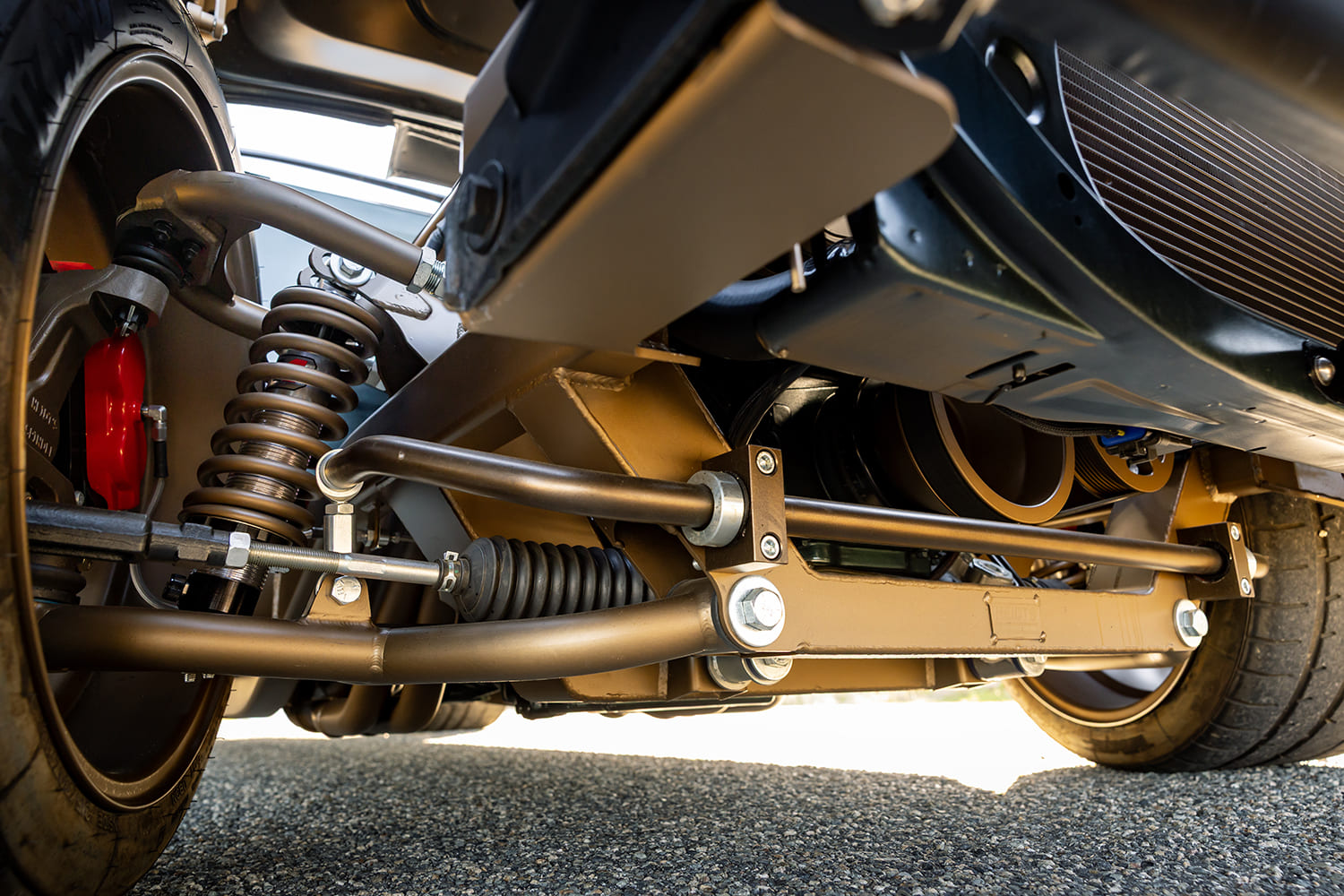 Rear Suspension: Heidts four-link and 1-inch rollbar, QA1 coilovers, Detroit Speed & Engineering mini-tubs