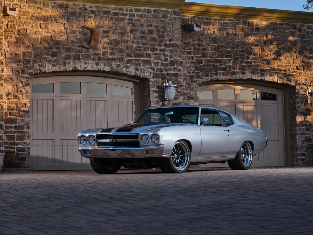 002 Frontal view of a silver 1970 Chevelle SS against a stone garage dusk light