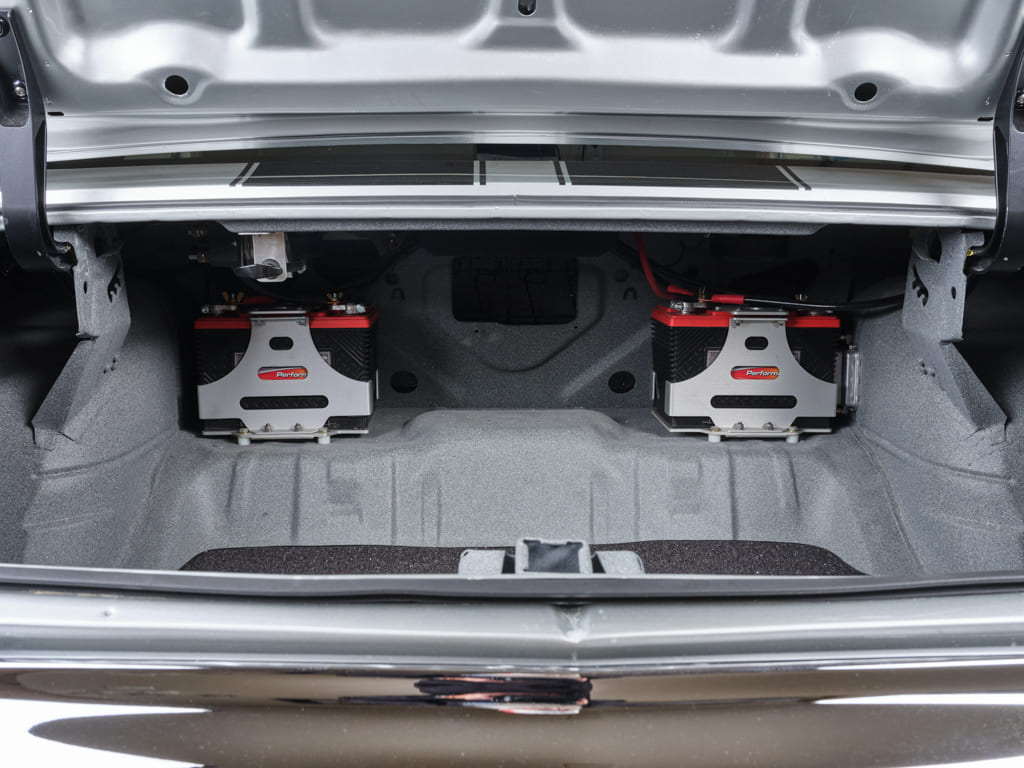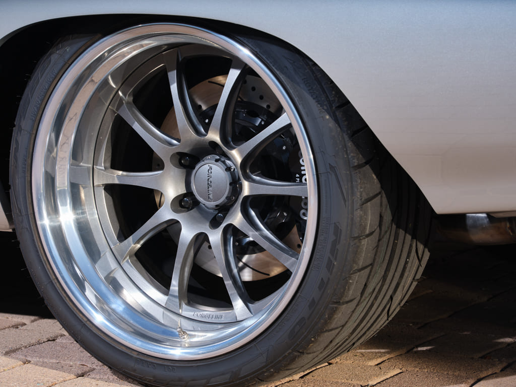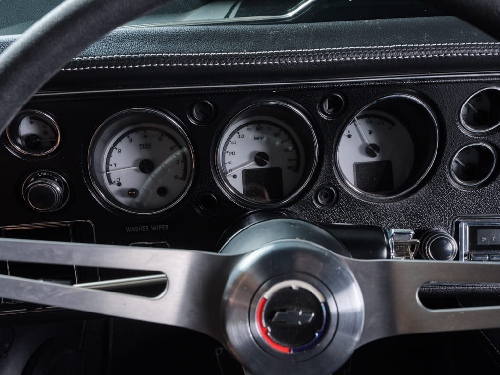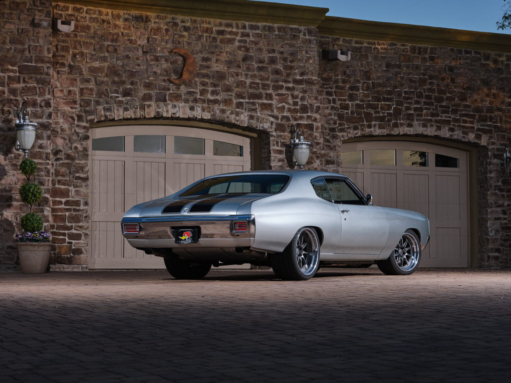 A set of 19- and 20-inch Forgeline GZ3 wheels offer modern style with an edge of vintage flavor and are wrapped in Nitto NT5 G2 rubber creating a recipe for a high-g, asphalt-gripping driving experience designed to put every ounce of that AME chassis to good use. The Goodfellows gang stitched in a set of rear tubs in order to fit the massive tires and wheels that didn’t exist when the portly Chevy rolled off the assembly line back in 1970.