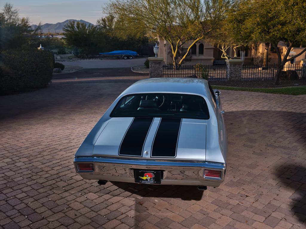 016 Rear view of a 1970 Chevelle SS with desert landscape in the background