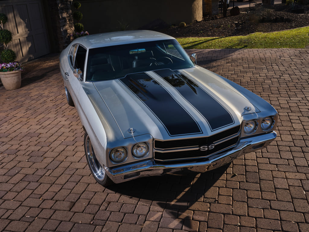 003 Aerial view of a silver 1970 Chevelle SS's front end and hood stripes