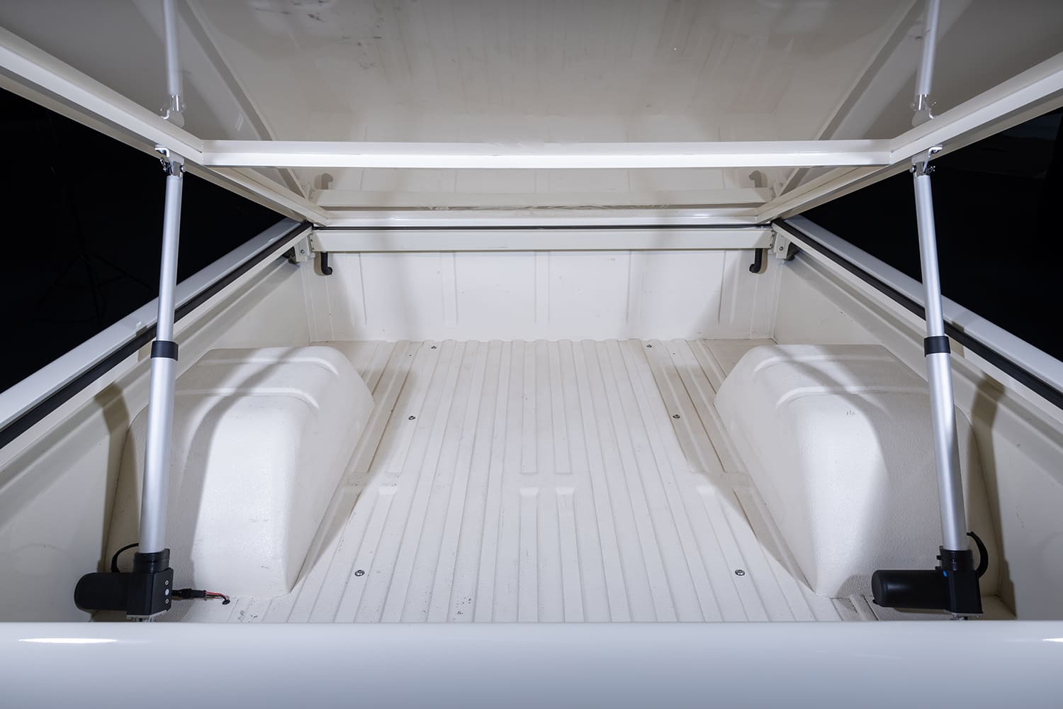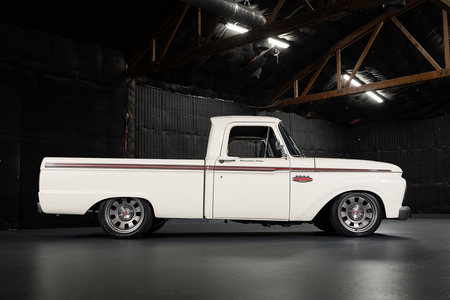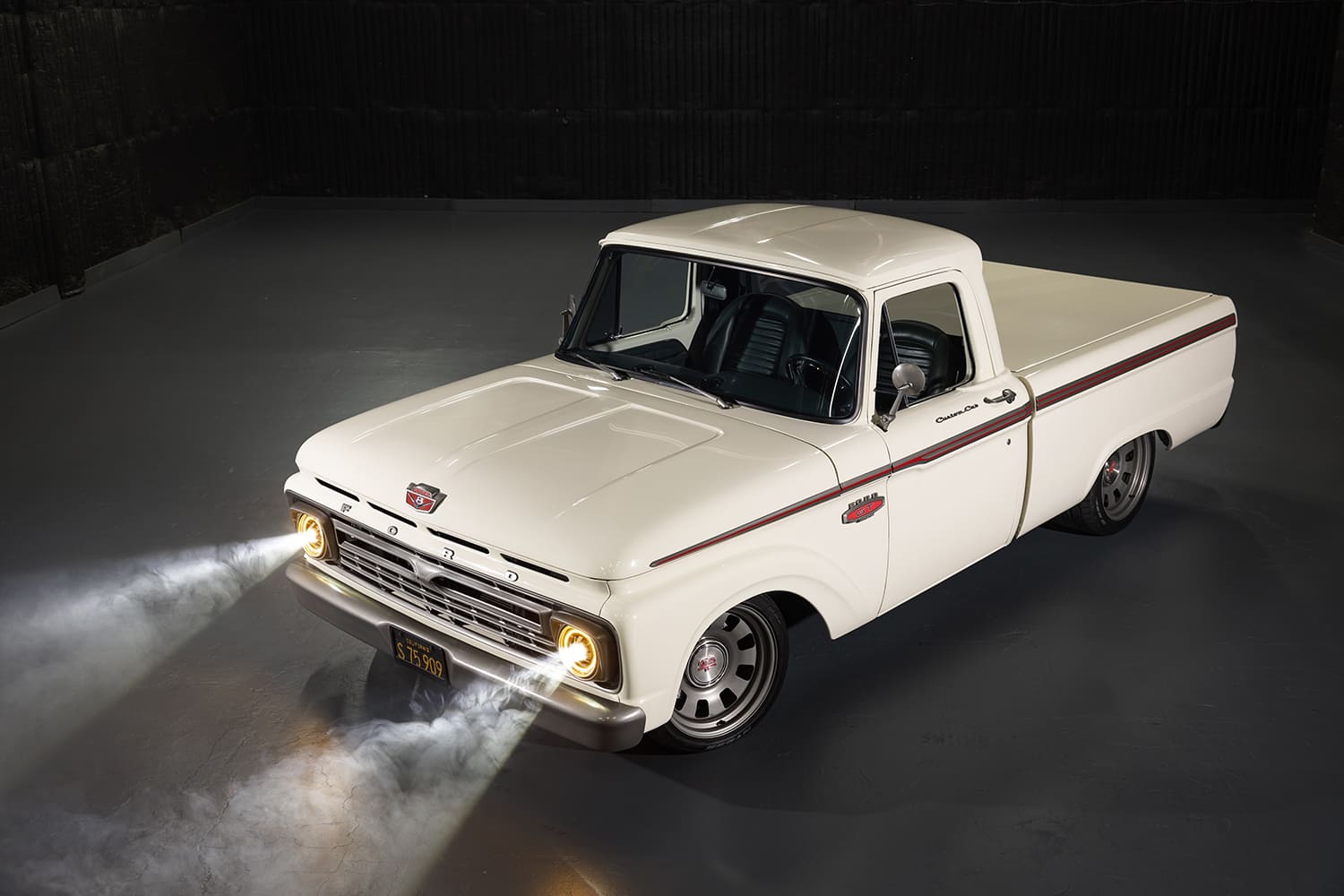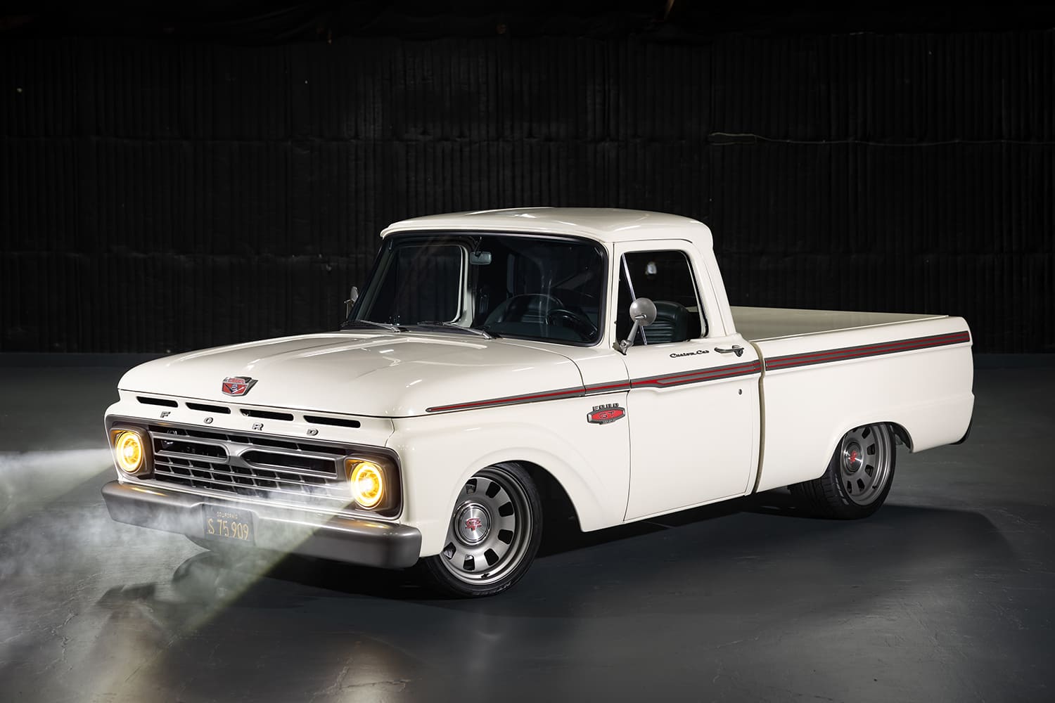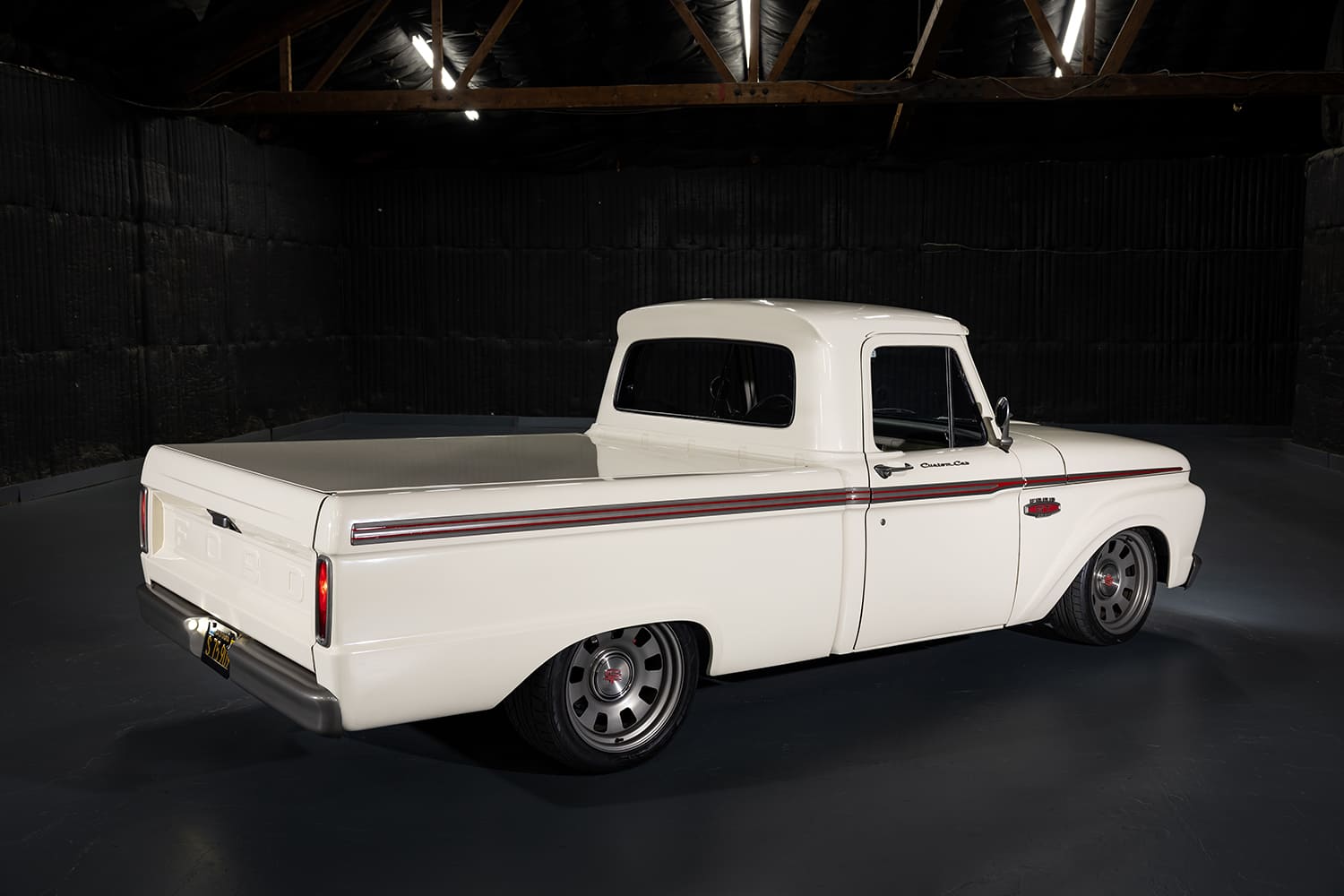 The F-100 came to Randy already in shortbed form and sporting factory Wimbledon White paint—a huge bonus, but he did find his way to tweaking its appearance just a bit. “When [Osterloh] saw that I had the entire truck blown apart, he extended my time in the warehouse so I could paint everything while I was at it,” Randy says. “I called California Sandblasting right away since they could come to the warehouse to blast all the body parts. I then sealed them with a SPI (Southern Polyurethane) epoxy primer. After that, I narrowed, tucked, and shaved the bumpers, block sanded for months, and shot the truck in the original Wimbledon White PPG Evolution single-stage urethane. I then contrasted the bumpers, grille, trim, and wheels with a custom satin warm gray metallic and added the Pro’s Pick bed cover and Dapper Lighting headlights and tails.”