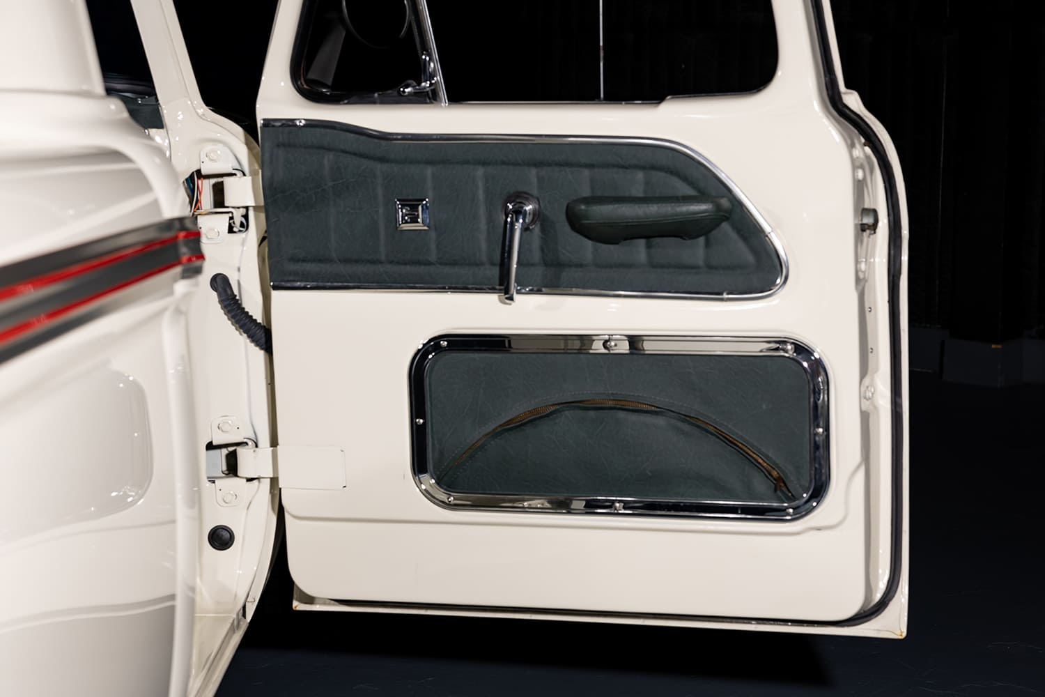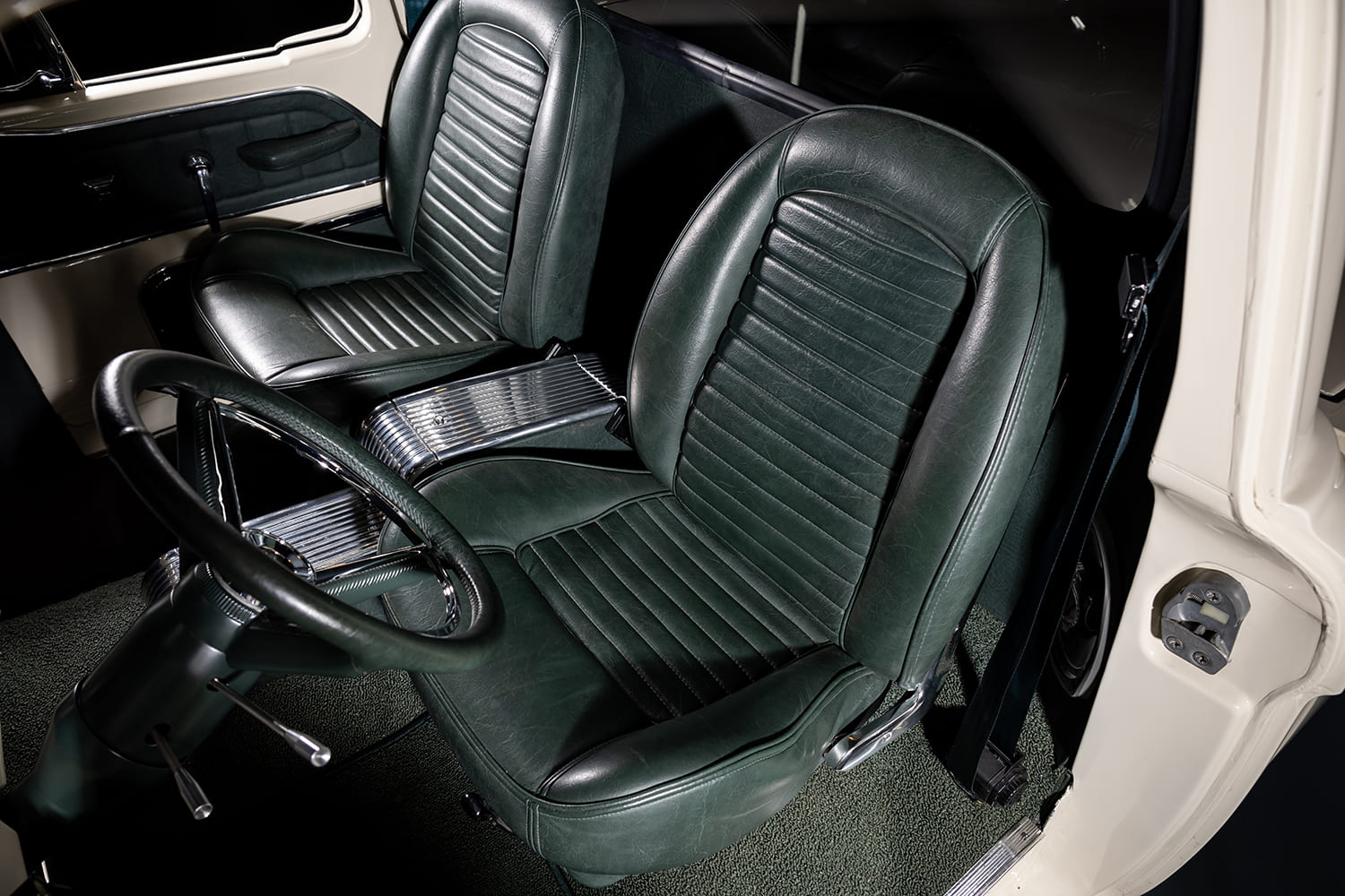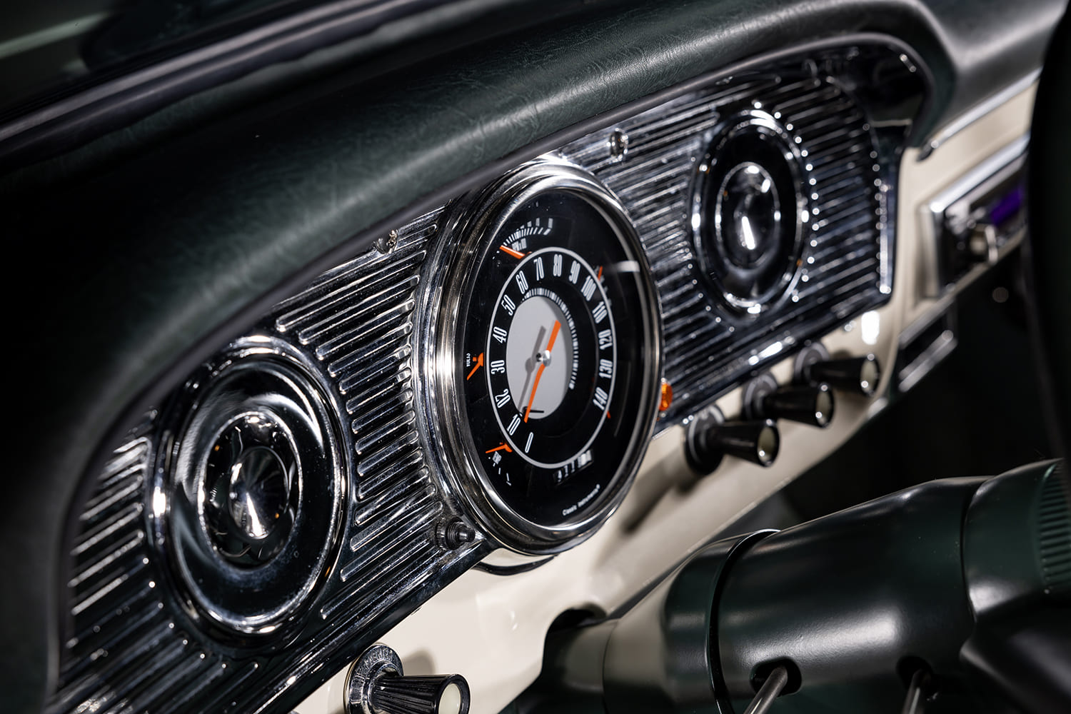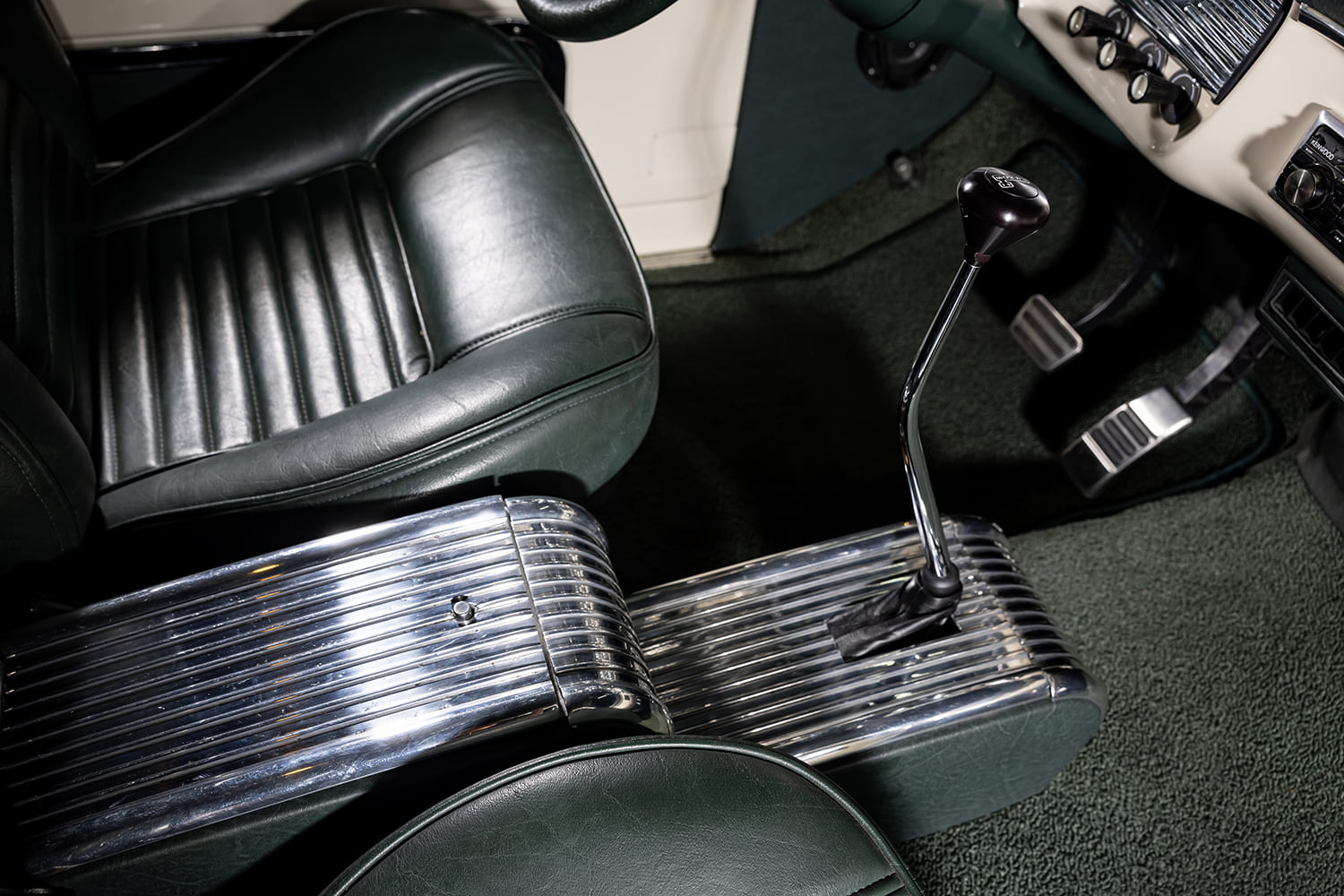 Moving into the cab, Randy delegated the job of recovering the 1966 Mustang seats in dark green vinyl to his friend Julian in Long Beach, California. Randy came through with the assist, as he wrapped the dash, door panels, kick panels, and headliner in the same dark green material. He then moved onto fabricating a custom console made from two ’63 Falcon consoles cut and welded together for a cool waterfall-like effect to surround the Lokar shifter. Next, Randy threw in a Dakota Digital 10-function remote module to properly control the power windows and door locks and power bed cover.