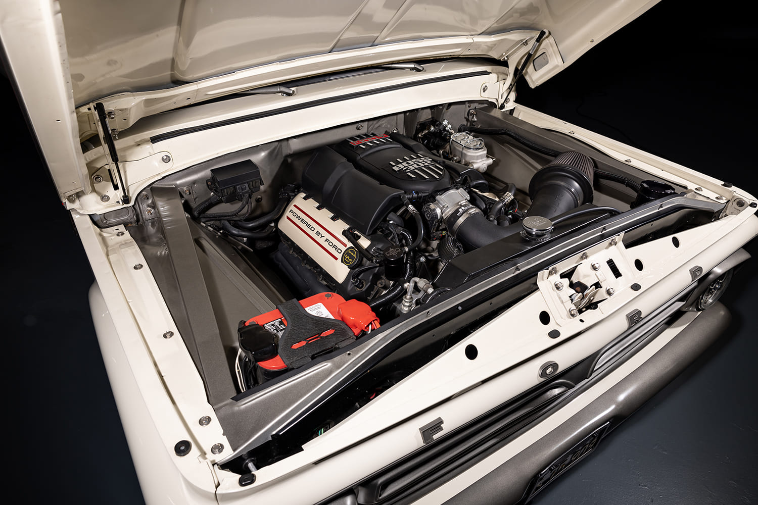 With the F100’s suspension coming together nicely, Randy then moved onto the next step of the build, which included the removal of the 5.0 he swapped in years ago with another very special engine that he had stashed away for just the right occasion. “I made the jump to a Gen 2 5.0L from a Mustang GT,” Randy says with pride. “My truck had been Mustang GT–powered since 2012, so I figured why not keep the theme going? That’s the reason I started referring to my truck as a 1966 F-100 GT. I even had custom GT badges made for the fenders and intake manifold.”