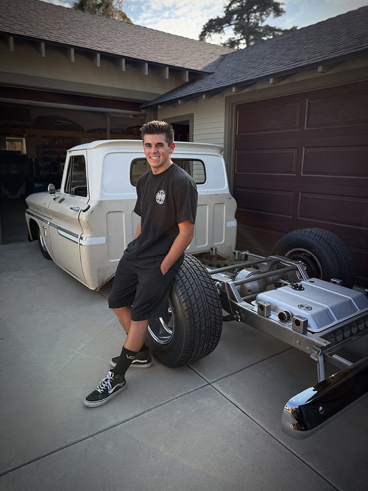 It’s been a minute or two since we visited with our up-and-coming teenage trucker, Carson Reed—he’s still in high school, so we’re cutting him some slack! After making good progress with his 1964 Chevy’s “mid-length” chassis all situated with the Scott’s Hotrods four-link and IFS (both custom tailored for extreme-low ride height with his dad Ryan’s tutelage!) and Wilwood brakes fore and aft, Carson buttoned up the wheelbase adjustment on the frame and the bed sheetmetal/Brothers’ oak wood floor. With the Scott’s front crossmember set exactly where he and Pops wanted it, the stroker 383 and his manual gearbox—a Silver Sport Transmissions TKX—that had been patiently waiting their turn in the corner of the shop got a little attention. We’ll let Carson take it from here:
