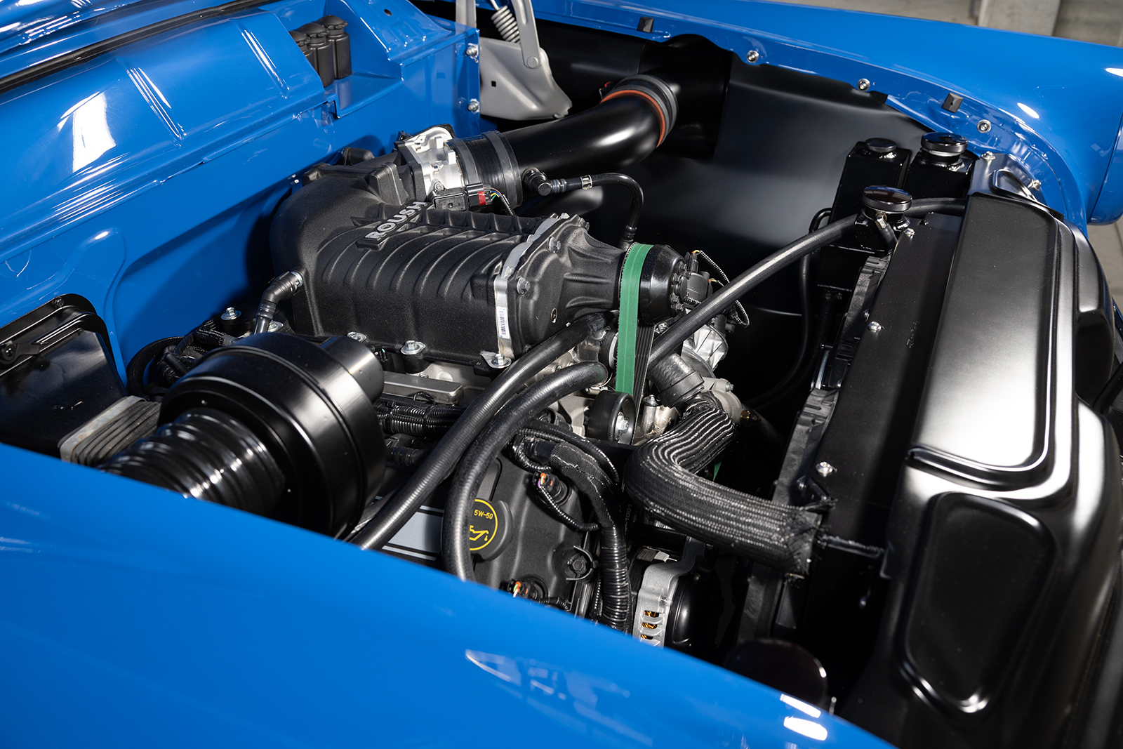 Tim is also the kind of guy who likes old vintage motors and doesn’t do any crazy driving or burnouts. However, he does like to get up to highway speeds quickly without hesitation. He also knows a few guys at Roush Performance and owns one of their motors in a 1933 Ford roadster. So, he decided to get their EFI-equipped supercharged 5.0 Coyote engine for this car. Helping the engine breathe is a custom intake tube, and at the other end is a set of 2-1/2-inch custom headers and exhaust with Walker mufflers. Harnessing the 600 hp of the powerplant is a Tremec 6-speed manual transmission with McLeod clutch that utilizes a TAD Drive shafts custom driveshaft to activate a Strange Engineering 9-inch rearend with limited-slip differential and 3.70 gears. To make this car more road trip friendly, the team at Dean’s 26-gallon aluminum custom fuel tank with an Aeromotive fuel pump to feed the engine.