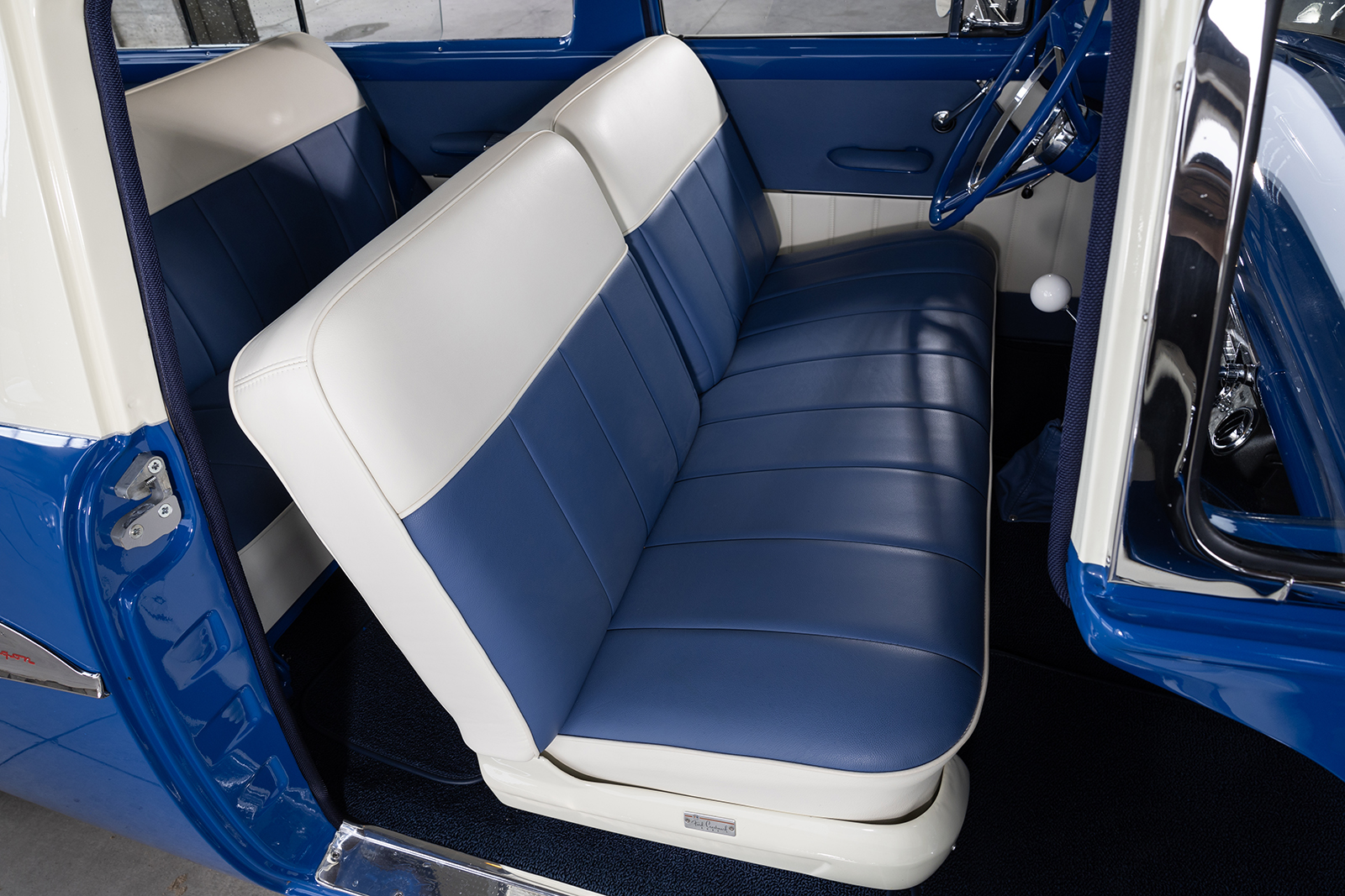 Though the car was originally painted in a lighter blue and white, Tim and his wife wanted to change it up a bit. After seeing a few cars at the Grand National Roadster Show, Livermore led them in the right direction for the custom-mixed blue and cream PPG paint it was coated in. This car was in such good condition that all the original trim was refinished except for the dealer tag, which had to be recreated. Finishing off the exterior look is a set of 17×8 and 17×9 Smoothie billet wheels from Wheel Smith that have modified vintage Ford hubcaps. Maintaining a squishy ride is a set of 225/55R17 and 225/60R17 Cooper tires that help keep traction with the pavement.