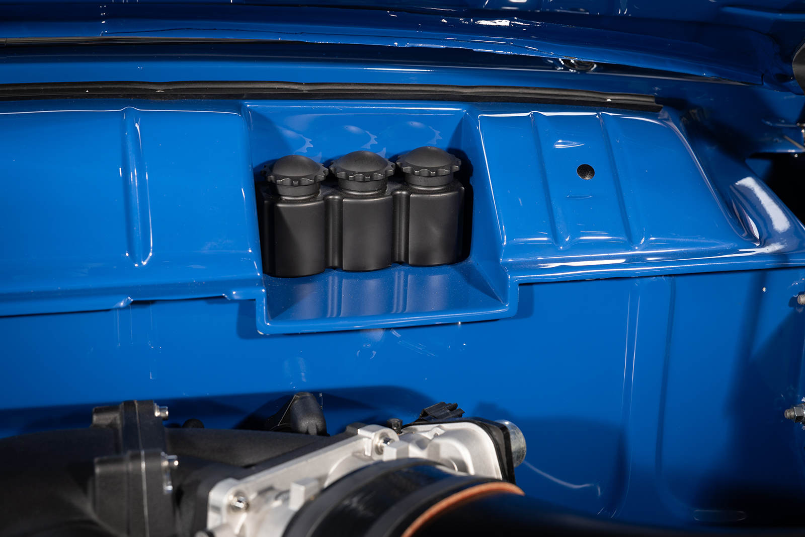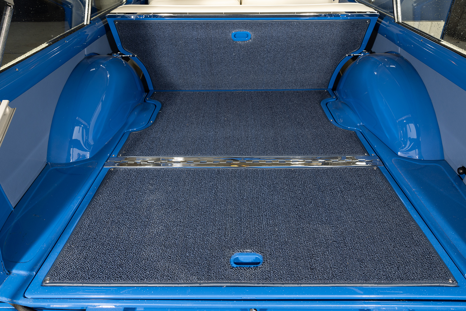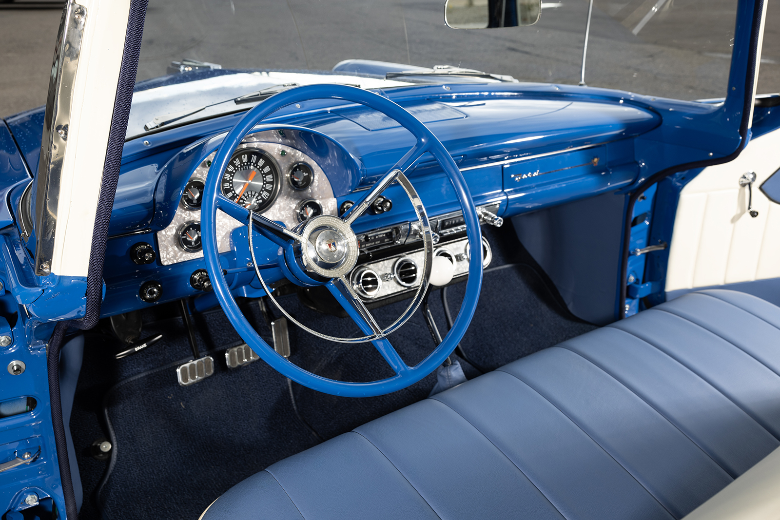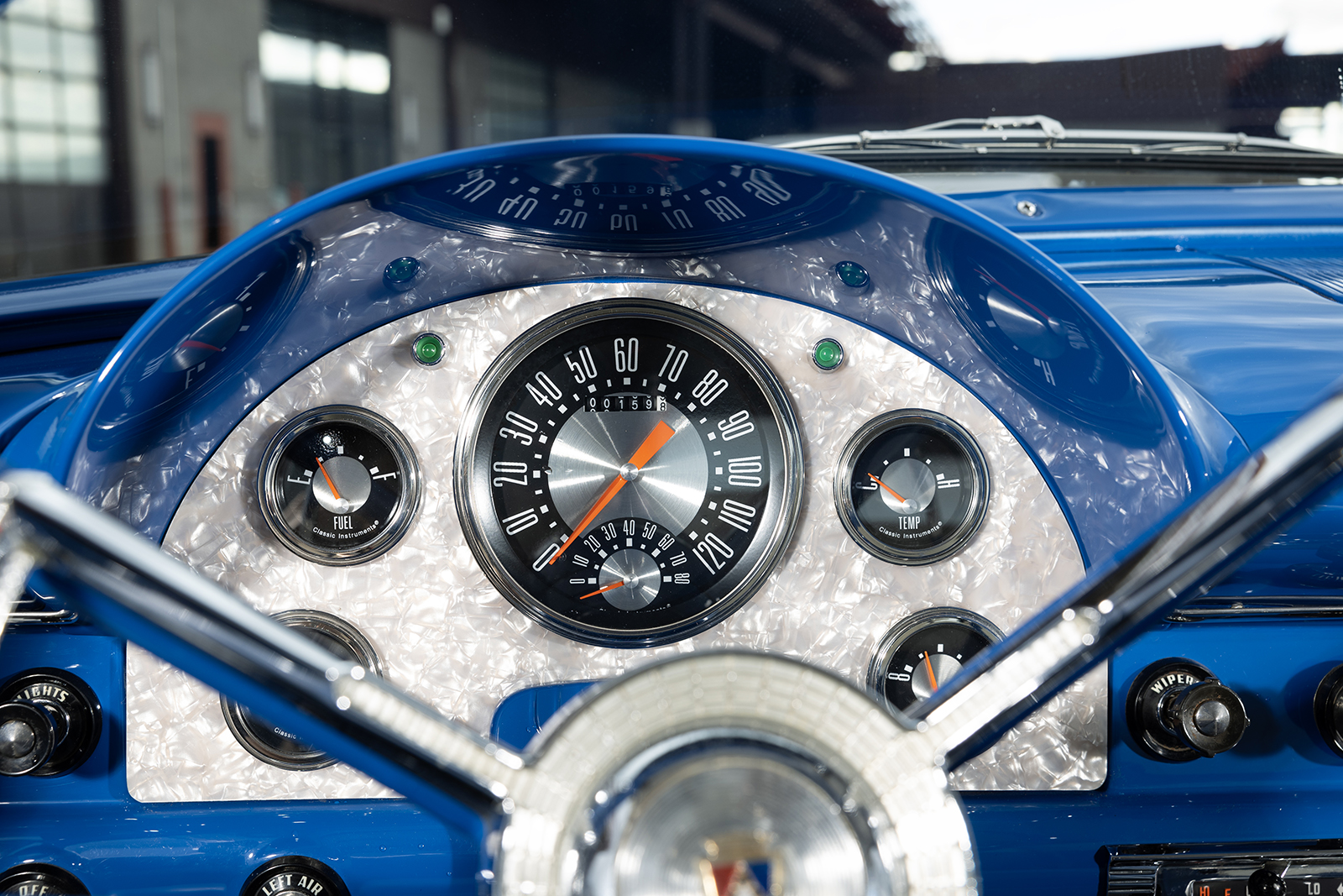 On the inside, some minor changes were made to improve the original styling of the car. Up front, the dash was modified to delete the stock pad. Then, Rick Love was able to help source a Mother of Pearl panel that now holds the Classic Instruments gauges and matches the Vintage Air climate-control unit. Then, the stock steering column shifter was eliminated and replaced by a floor-mounted Hurst shifter. In the back, an opening panel was made to hide the relocated Optima battery, and the spare tire pocket was modified to fit the enlarged gas tank. Topping it off, Ciadella Interiors reupholstered the stock seats and door panels in blue and white leather.