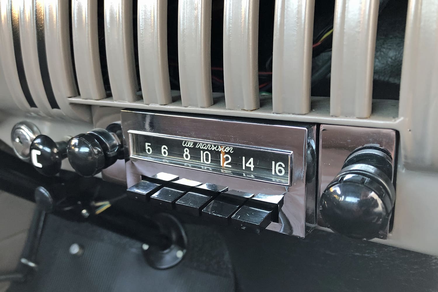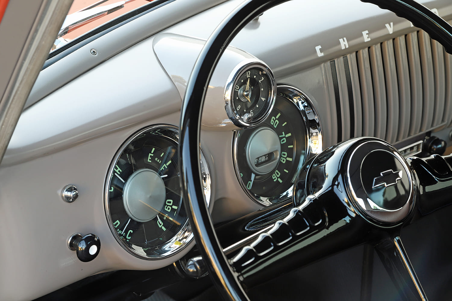 Finally, properly and comfortably running, the Coppertone pickup entered the 2024 GNTS show, where it received a Truck-In Pick award from Classic Truck Performance magazine. Richard has since been driving it extensively all over Southern California, raving about the smoothness of the coilover suspension. Displacing 235 ci, the matching-number six-cylinder motor runs like a champ, with its 1957 head (and valve cover) featuring a slightly higher compression. A Buffalo Motors adapter allowed the installation of a Turbo 350 automatic transmission, topped with a stock-style four-speed shifter. We should also comment on the beautiful leather upholstery by Miguel Carrillo, as well as the good-looking dash that integrates a very rare N.O.S. accessory dash clock.