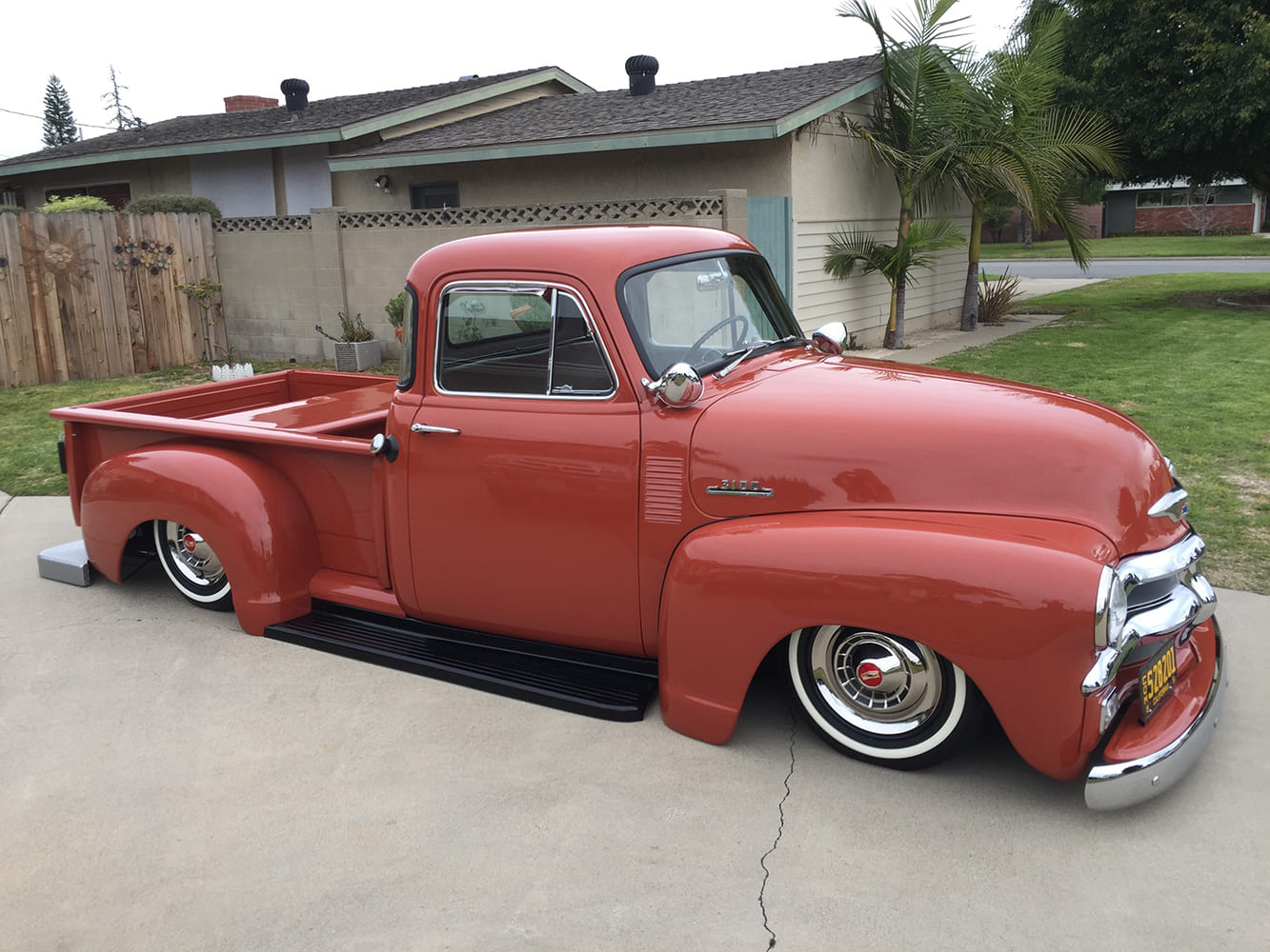 19 1954 Chevy 3100 lowered stance hot rod build chrome bumper parked vintage look