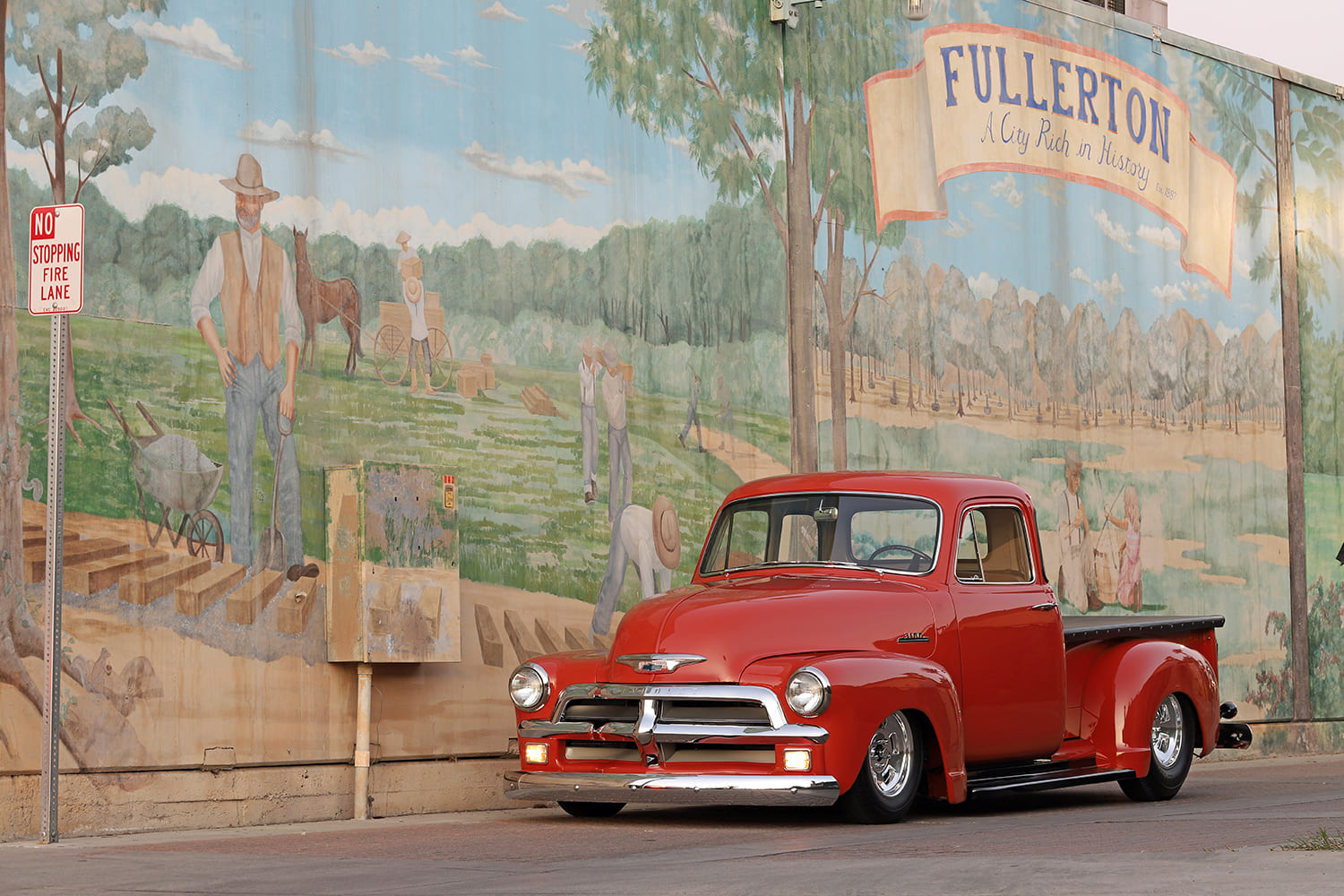 03 1954 Chevy 3100 hot rod rear view custom pickup truck parked mural background