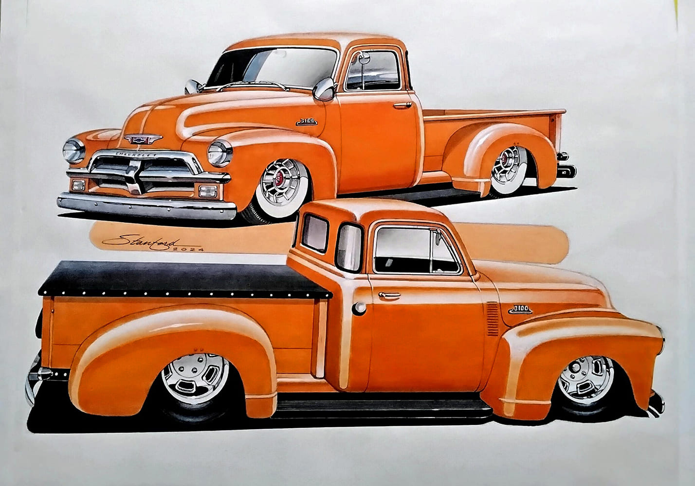 17 1954 Chevy 3100 custom rendering concept art lowered truck design Stanland 2024 illustration