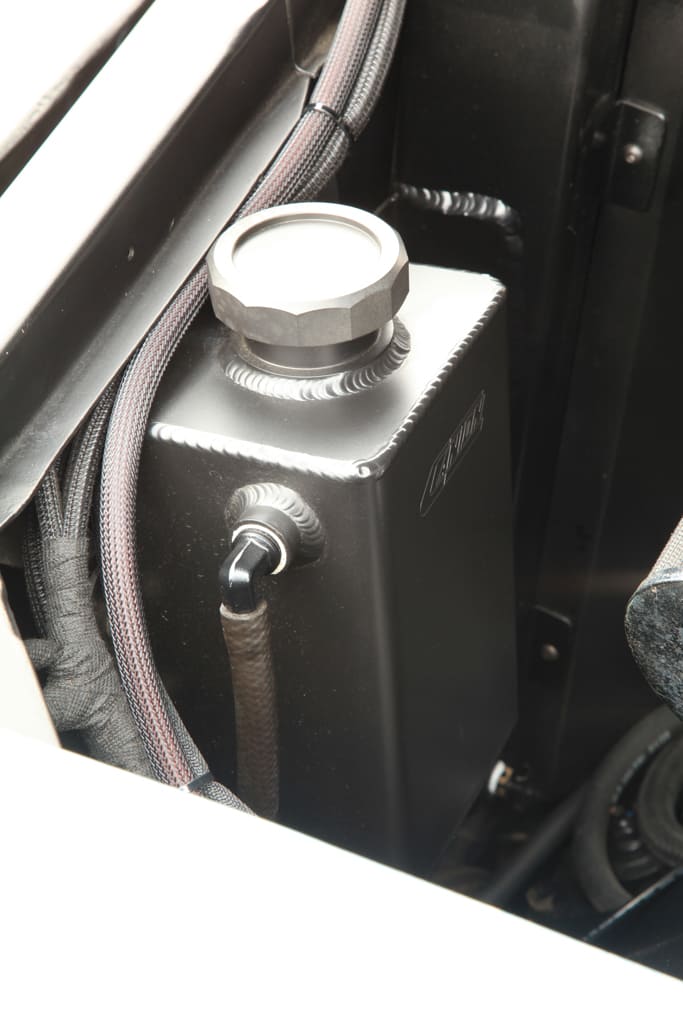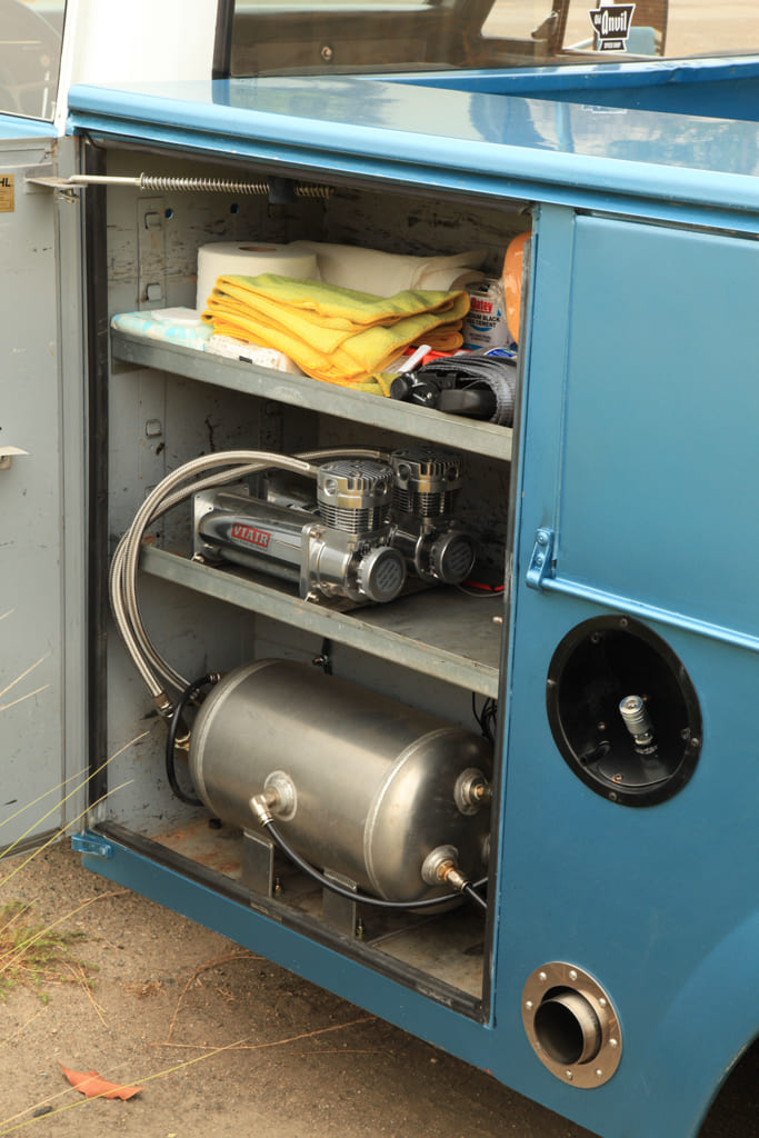 Next, the original 327 and four-speed trans were swapped out in favor of a 5.3L LS backed to 4L60E running to a 14-bolt rearend. The motor’s spent gases exit through a set of Doug Thorley headers and a stainless steel exhaust system that empties out a small port just in front of each rear wheel. Old Anvil also specializes in Cerakoting, and used the finish on a pair of billet aluminum valve covers they designed and milled for Ruben’s V-8. Up in the engine compartment the ignition coils were moved to the back of the engine, and a Canton radiator overflow tank is also utilized (with a billet Old Anvil cap), as is a Fragola Performance Systems 100-psi fuel pressure gauge mounted to the firewall for quick reference. One of the boxes in the 8-foot STAHL utility bed that houses the compressor for the truck’s Ridetech suspension.