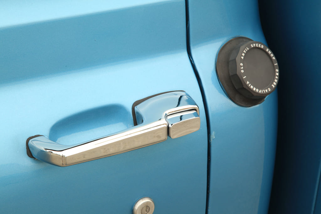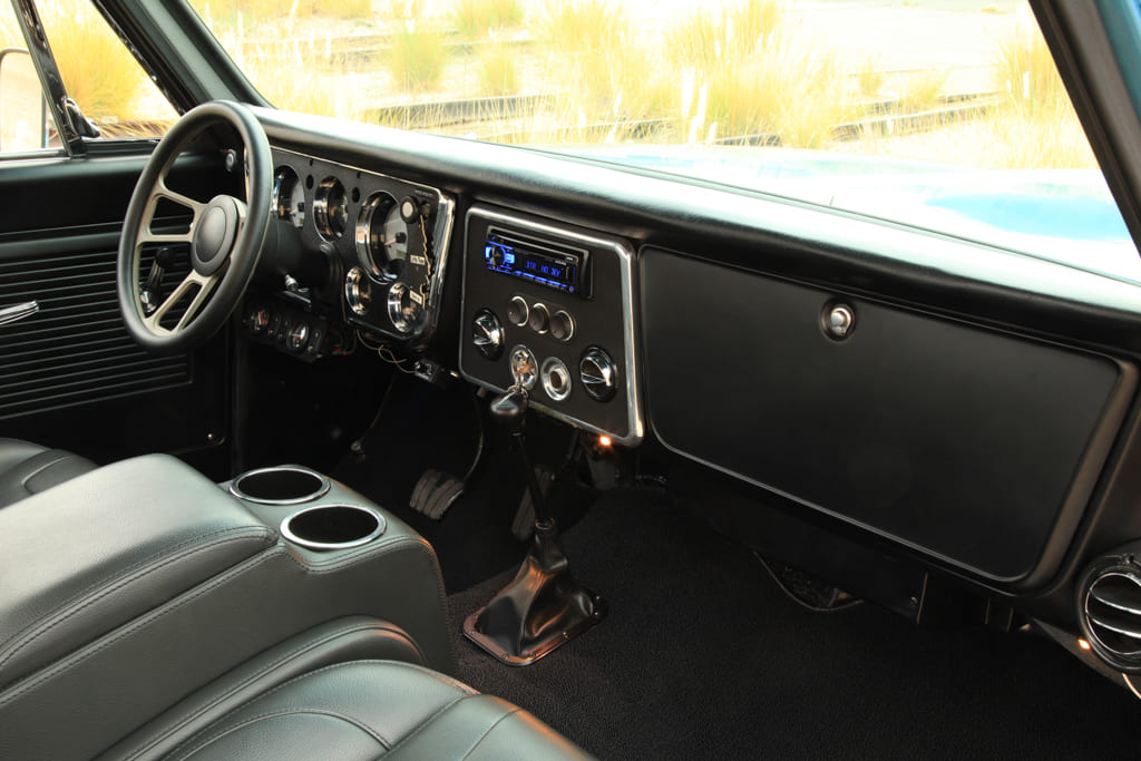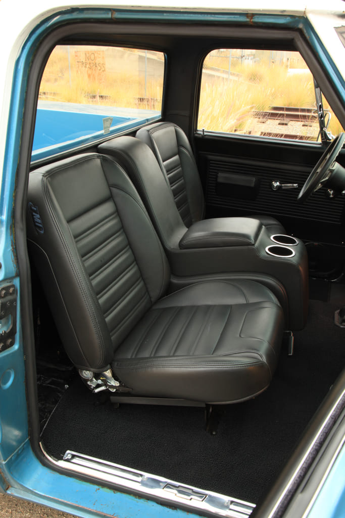 The blue and white color combo is the same paint that was on the truck when Ruben got it—only recently touched up here and there to even it out. Inside the truck’s cab Old Anvil rewired everything and milled a billet center dash panel to house the Alpine stereo unit that is heard through Alpine R 6-inch speakers and a 10-inch subwoofer. Leather bucket seats from TMI are used in combination with a center console with two cup holders (ever see a construction worker without a cup of coffee in his hand?). Dakota Digital gauges were also installed as was a Restomod Air A/C unit to supply the cool air.