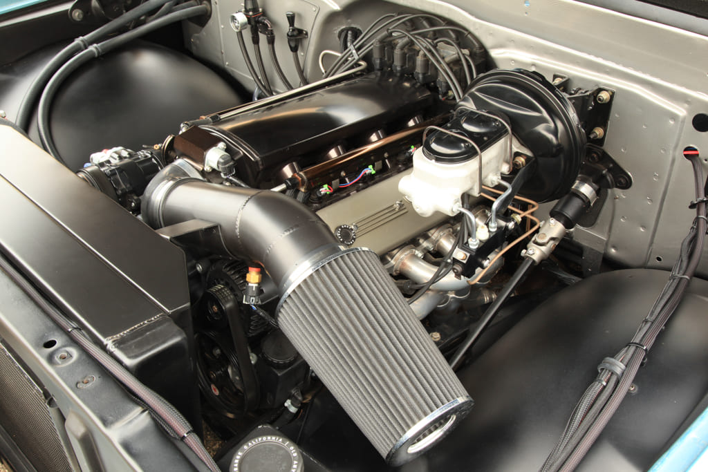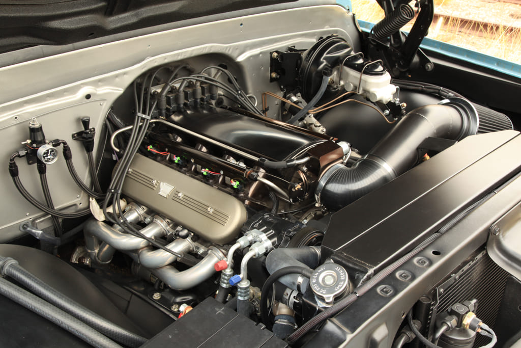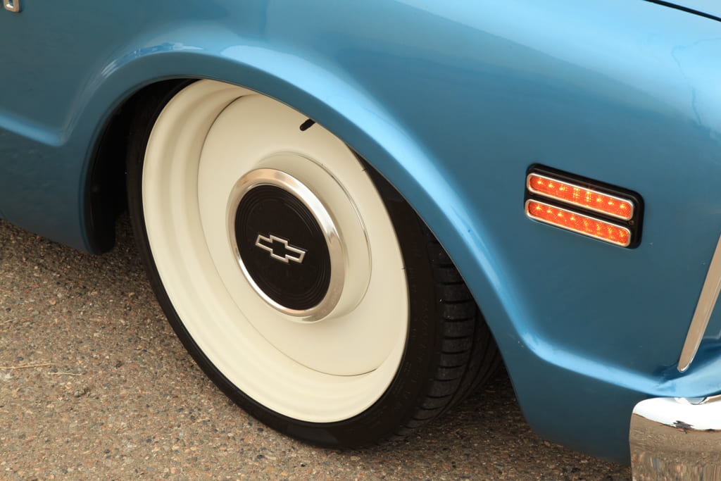 Old Anvil got to work addressing the fundamentals: stance and power. The chassis was stripped and a C-notch added out back because this truck was going to sit low. After powdercoating the chassis, a new frontend from CPP with upper and lower A-arms and disc brakes was installed along with a Ridetech bagged suspension. Most folks don’t notice what happened with the wheels at first glance, but the 20-inch steelies were powdercoated and clips added so Chevy S-10 hubcaps could be used.