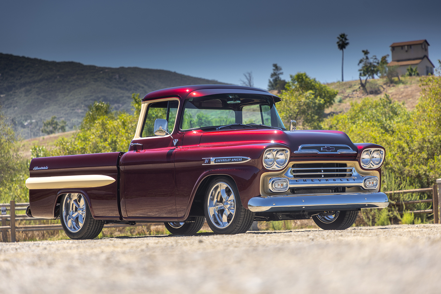 02 1959 Chevy Apache red custom truck front view chrome grille countryside backdrop classic stepside restoration showpiece