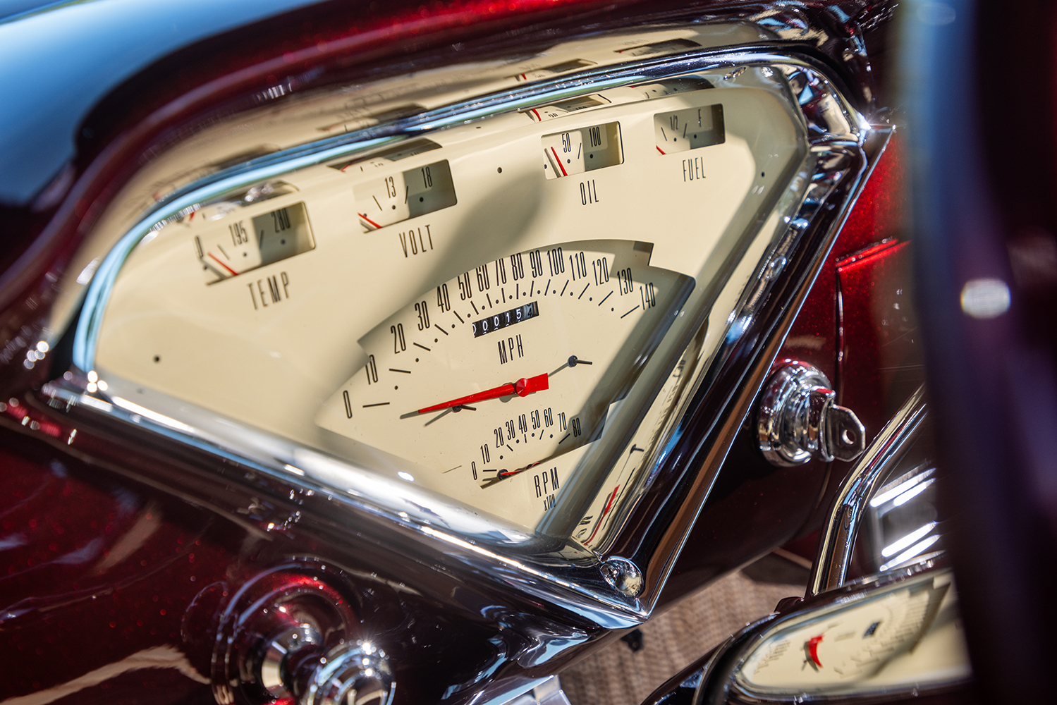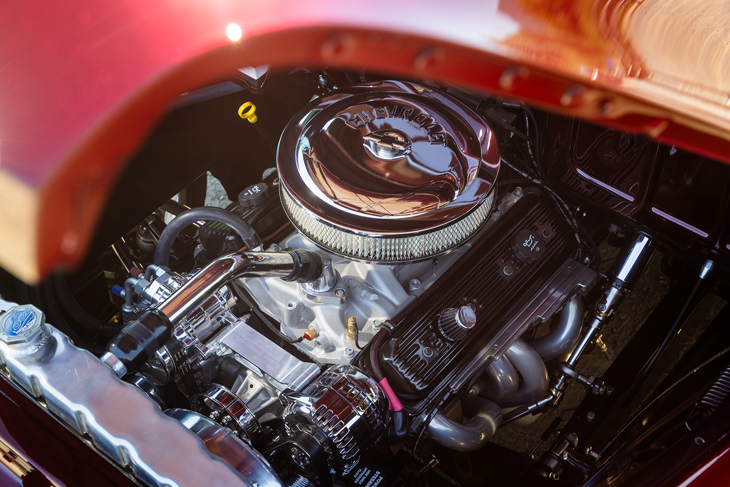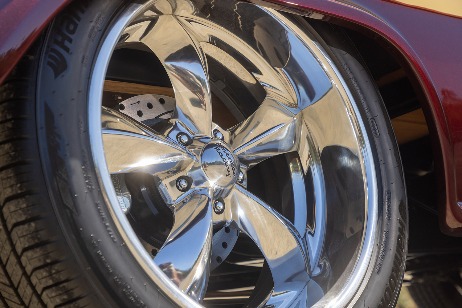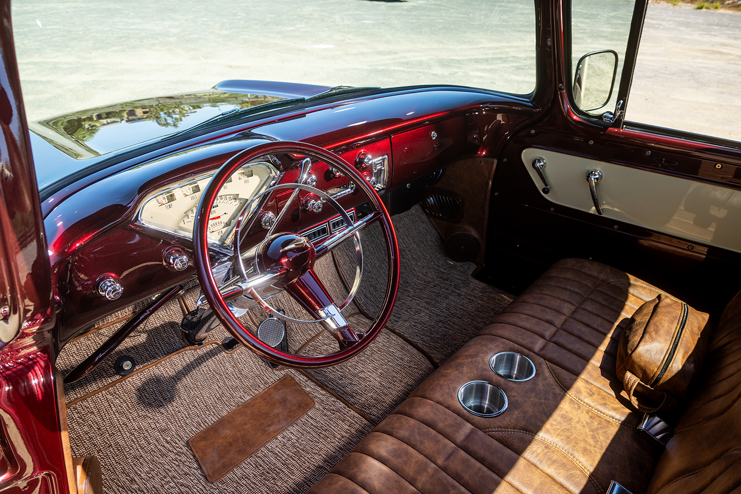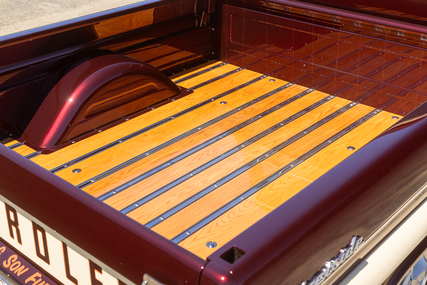OK, beneath that Kandy with a K glorious paint—with a cream white insert, mind you—there is a lot more to talk about! First and foremost, Randy’s non-paint crew swapped out the stock Task Force beam-axle chassis for an all-new Total Cost Involved foundation—complete with a crate small-block/700-R4, Ford 9-inch, and Wilwood discs capped with polished 18- and 20-inch American Racing Torq Thrust SL five-spokes. While mostly stock, with the exception of “filled holes, tightened gaps, and an Altman Easy Latch door kit” as HRCS told us, between the candied fleetside bed panels now lies a heavily clear-resin’d Mar-K oak bed wood floor. On the inside, nearby stitch-specialists Old Town Upholstery did up a Glide Engineering bench in distressed brown with multi-colored square-weave carpet below to complement the exterior-matched (painted) interior door panels. A 15-inch Bel Air wheel (painted to match the dash, of course) tops a chrome Ididit column, while the stock mechanical gauges have been swapped out with a Classic Instruments modern retro cluster and a Vintage Air system installed to, well, do what it does best: keep the Rushtons cool!