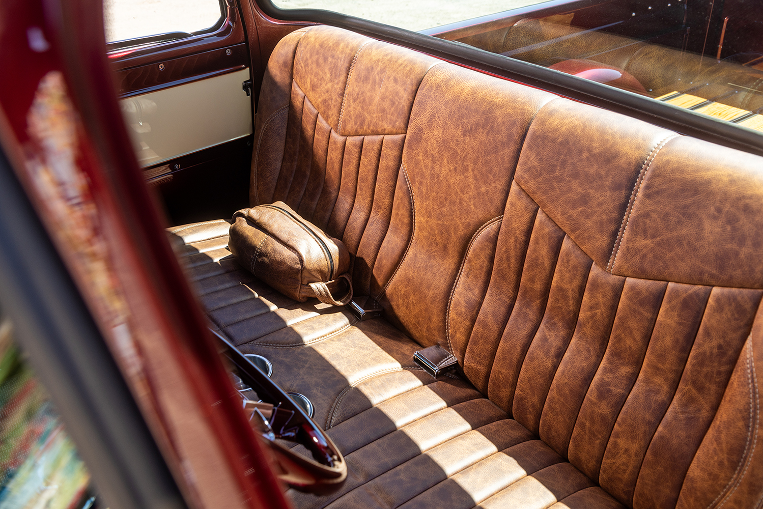 13 1959 Chevy Apache interior dashboard view custom maroon leather seats chrome steering wheel vintage truck