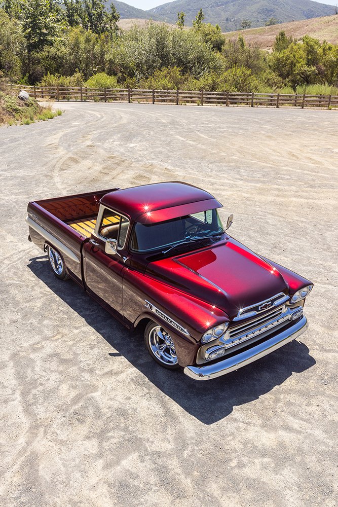 06 1959 Chevy Apache side shot maroon glossy finish custom chrome wheels vintage stepside restored classic truck