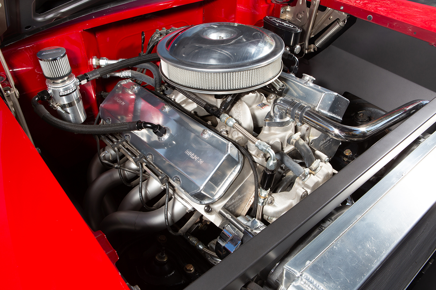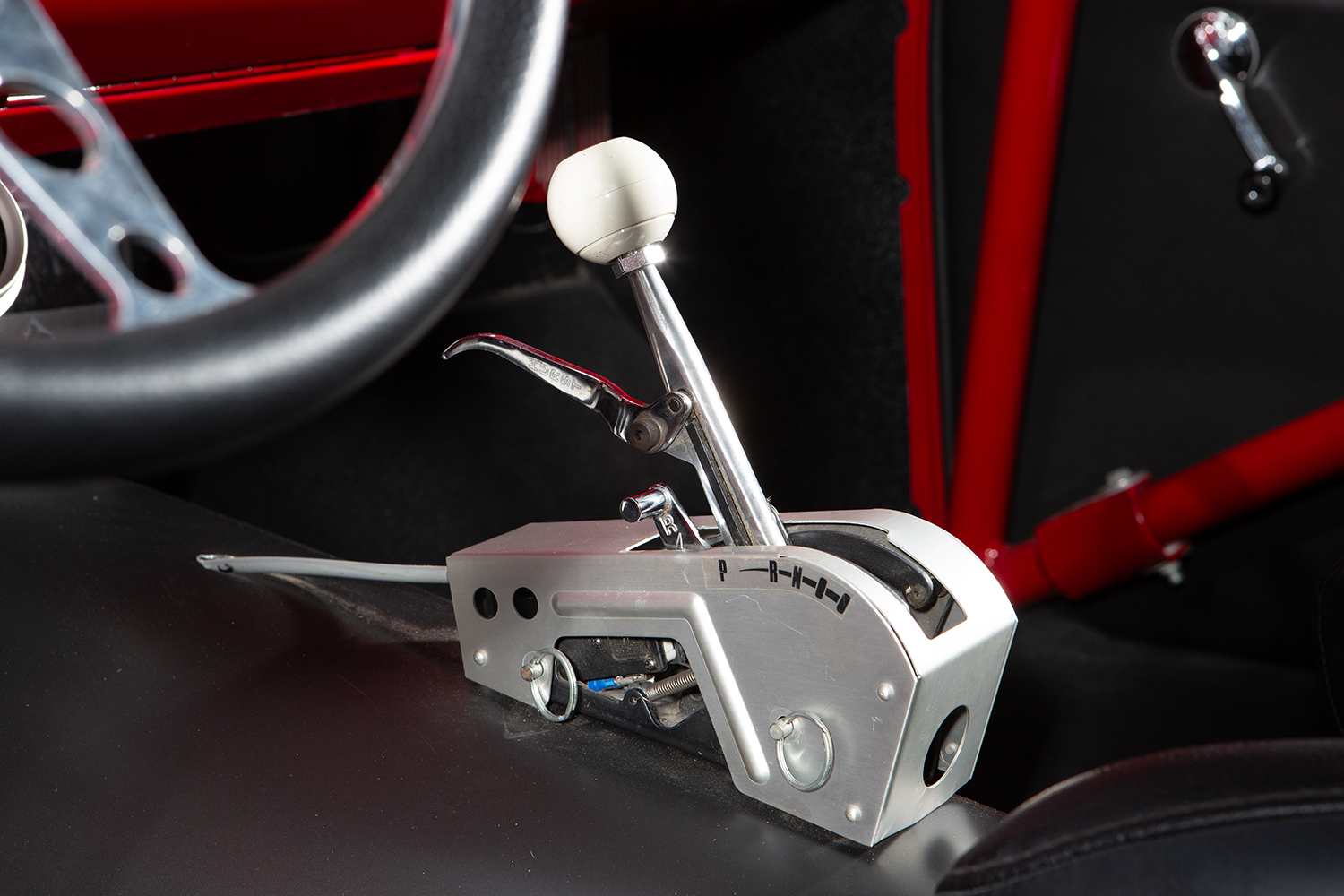 The chassis consists of an Art Morrison subframe with custom coilover mounts, QA1 shocks, and an early AME four-link rear suspension giving the car a functional and all-important aggressive stance. Weld Prostar wheels wrapped in Mickey Thompson rubber coincide with the car’s sinister demeaner that rely on a 12-inch rotor, one-piston caliper disc brake system front and rear.