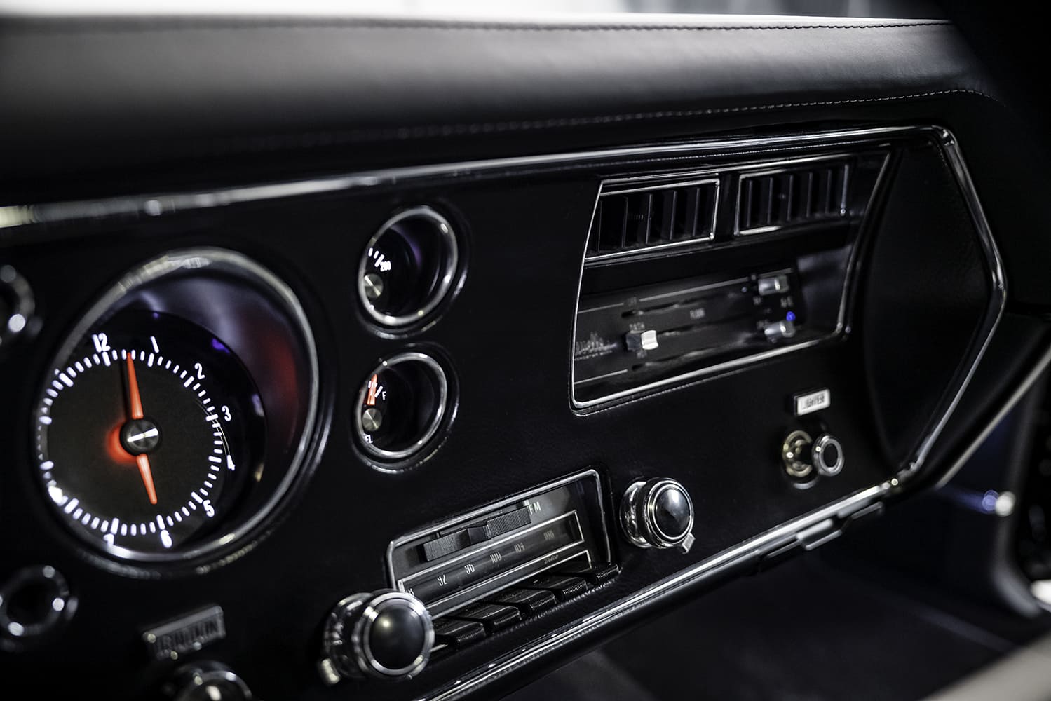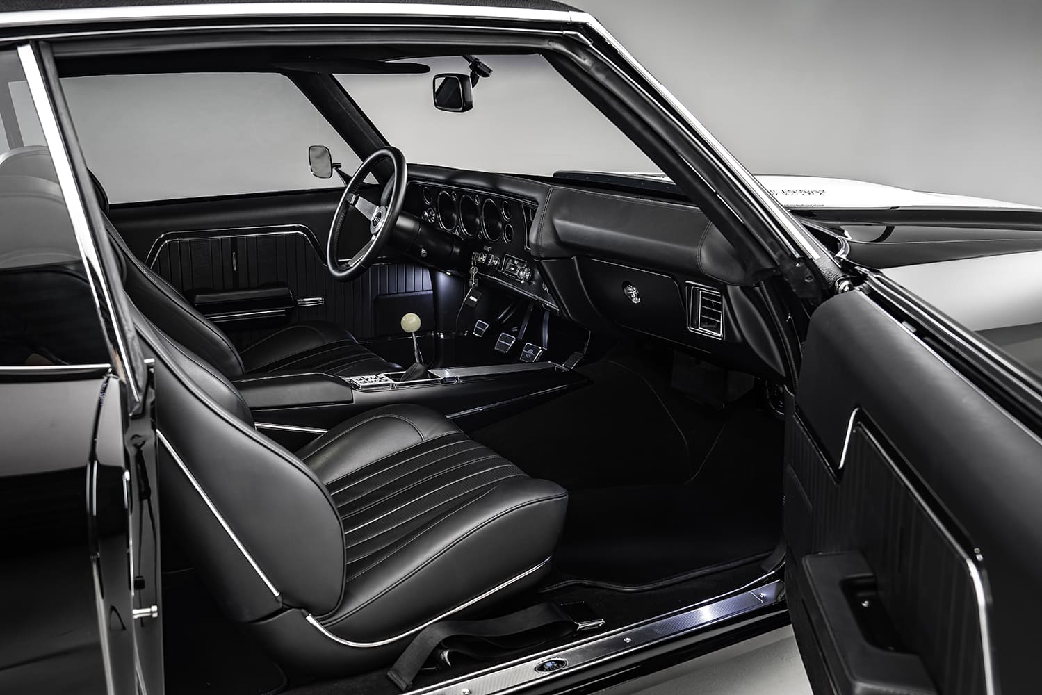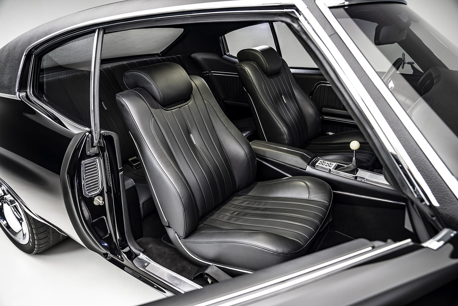 The 1970 Chevelle factory front bucket seats were reworked while the custom rear seating was fabricated and stitched in black leather by Avant-Garde Design’s Jeremy Carlson. The headliner, crafted from Alcantara material, was once again Carlson’s handiwork.