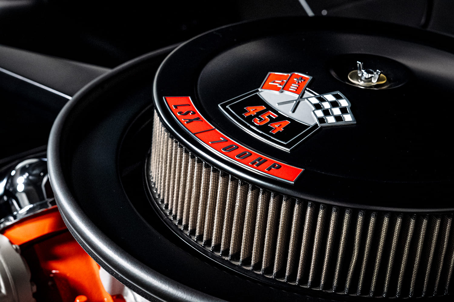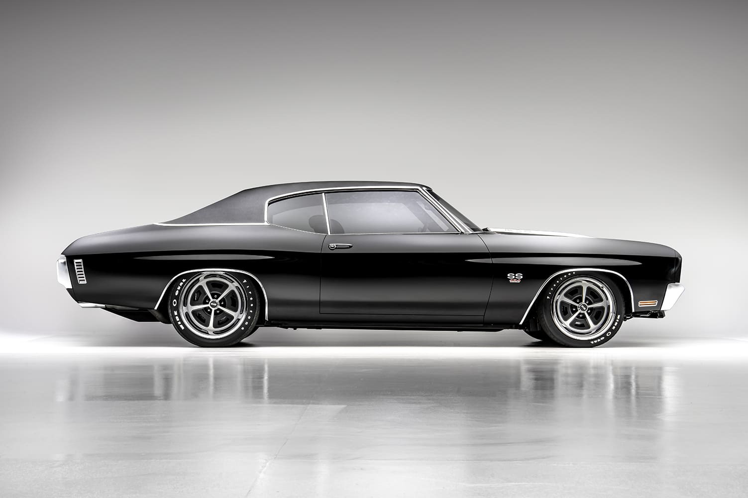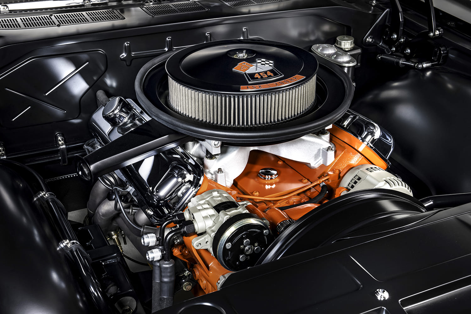 The 1970 Chevelle factory front bucket seats were reworked while the custom rear seating was fabricated and stitched in black leather by Avant-Garde Design’s Jeremy Carlson. The headliner, crafted from Alcantara material, was once again Carlson’s handiwork.