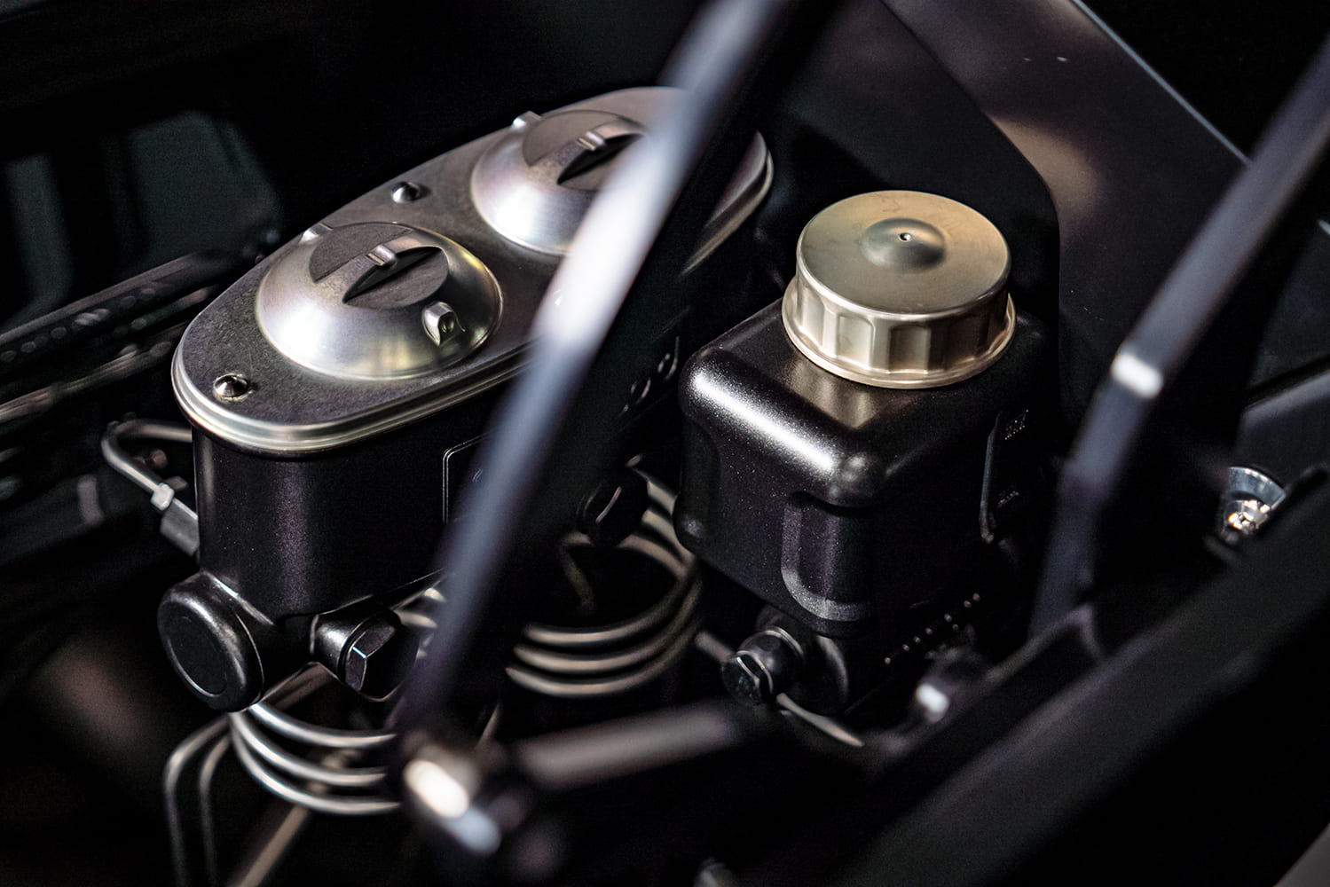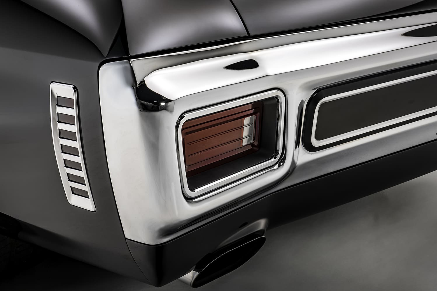 The fenders and all quarters were wholly reworked to fit flush with the bumpers, which were 90 percent hand built. The wheeltubs also received a custom treatment, as both inners and outers were fabricated to accommodate the robust wheel and tire combination. The lower valance represents another piece of hand fabrication, and extensive adjustments were made to the panels and gaps to ensure everything flows and aligns flawlessly.
