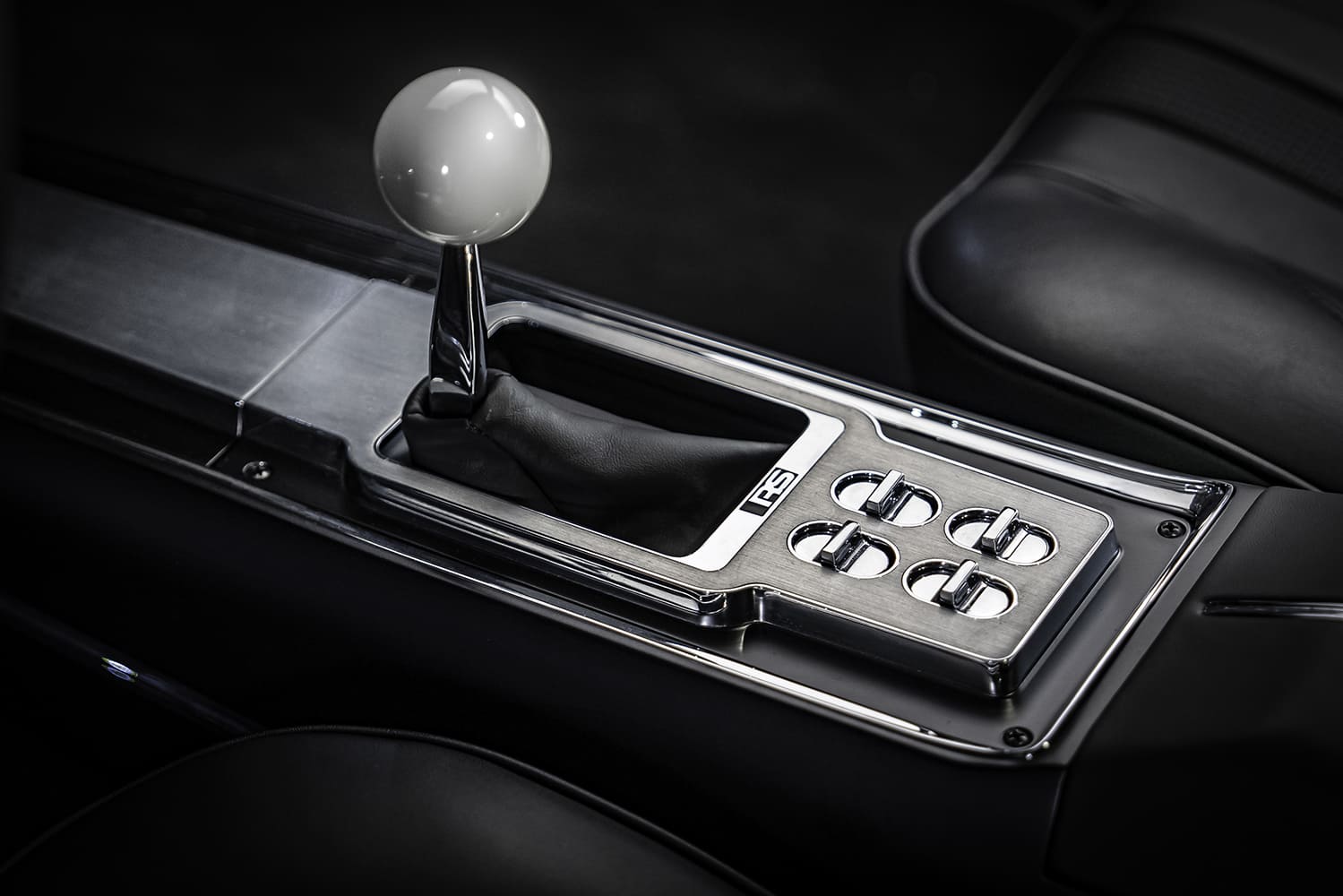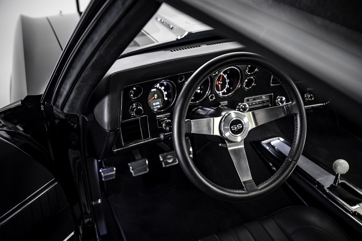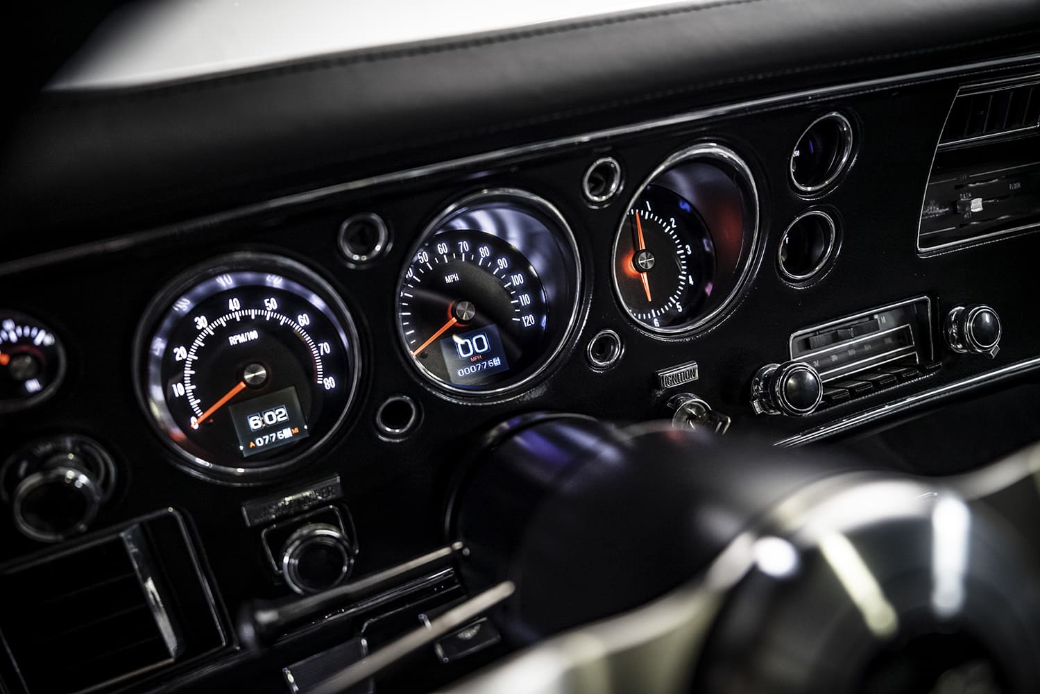 The interior is reminiscent of its past, but a handful of carefully placed alterations enhance and modernize its functionality. For instance, while the dashboard appears in stock, it features a custom pad from Avant-Garde Design. From here, the “almost” factory-looking instrumentation is the modernized Dakota Digital RTX gauge package, which offers an 8,000-rpm tach and a 120-mph speedometer, with digital readouts blended within the primary gauges.