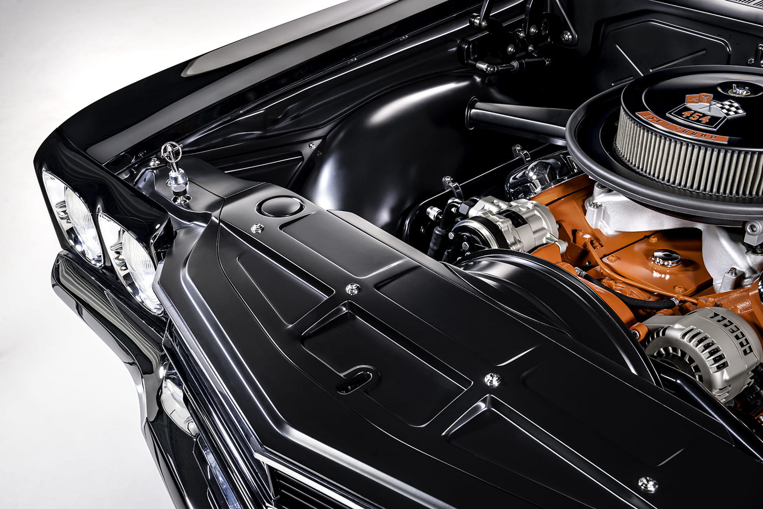 Again, while appearing factory, the steering column is now an upgraded Ididit tilt with ignition and floor shifter, all topped with a Lecarra three-spoke leather-wrapped wheel that resembles the factory style, featuring the traditional “SS” horn button. Other interior upgrades include Vintage Air’s Gen IV SureFit kit along with a complete American Autowire harness, replacing the outdated 55-plus-year-old wiring and now addressing all the car’s modern electrical needs.