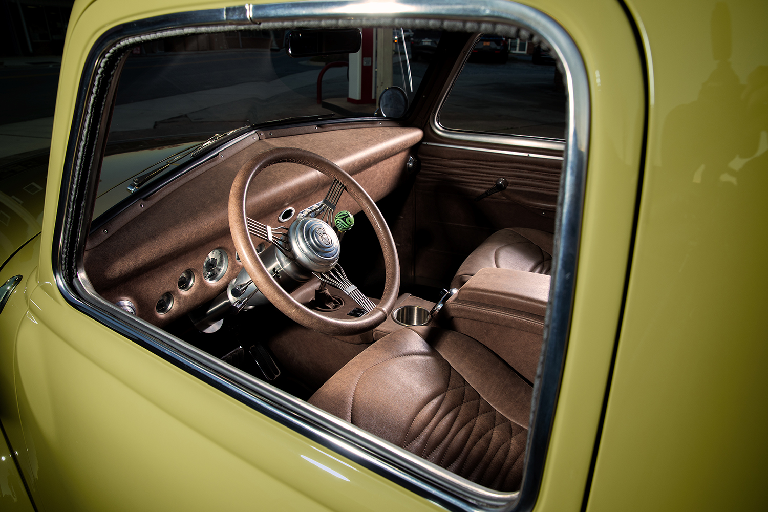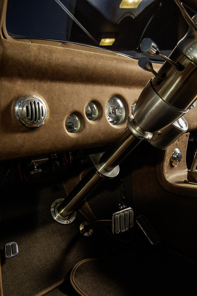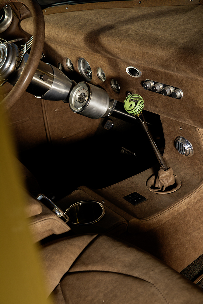 09 1952 Chevrolet 3100 cabin with a minimalist suede wrapped dash and polished metal trim