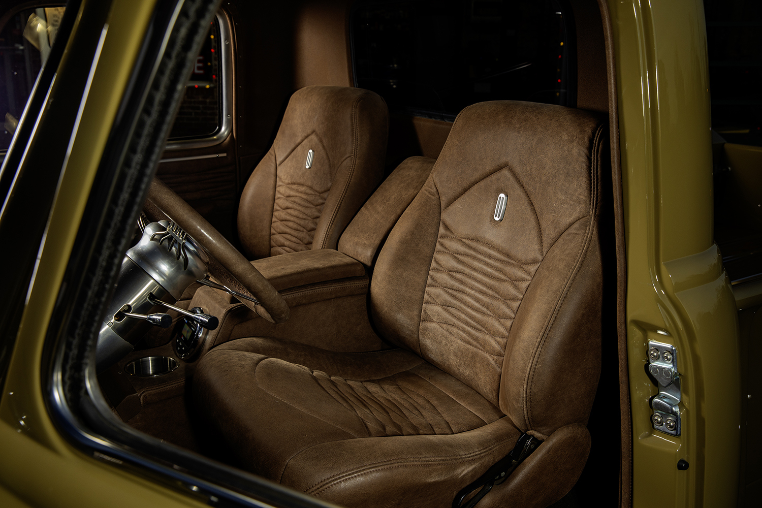 05 1952 Chevrolet 3100 interior with custom brown leather bucket seats and stitched detailing