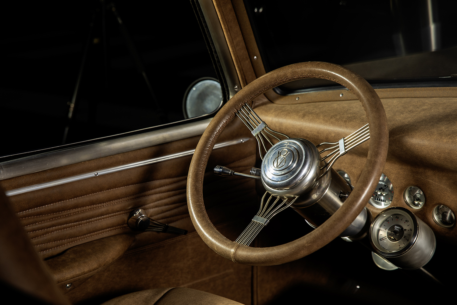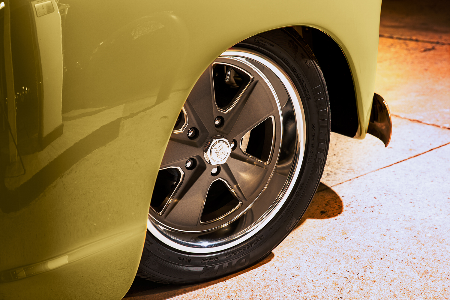 Inside, the truck’s cabin blends distressed Argentinian leather and handcrafted metalwork, showing Scott’s talent for upholstery. The gauges, recessed into the custom sheetmetal dash, are from Classic Instruments, adding to the truck’s refined feel. A Daytona carpet and Scott’s first-ever hand-wrapped steering wheel round out the interior details, creating a space that’s as functional as it is beautiful.12 1952 Chevrolet 3100 close up of custom bronze multi spoke wheels wrapped in high performance tires