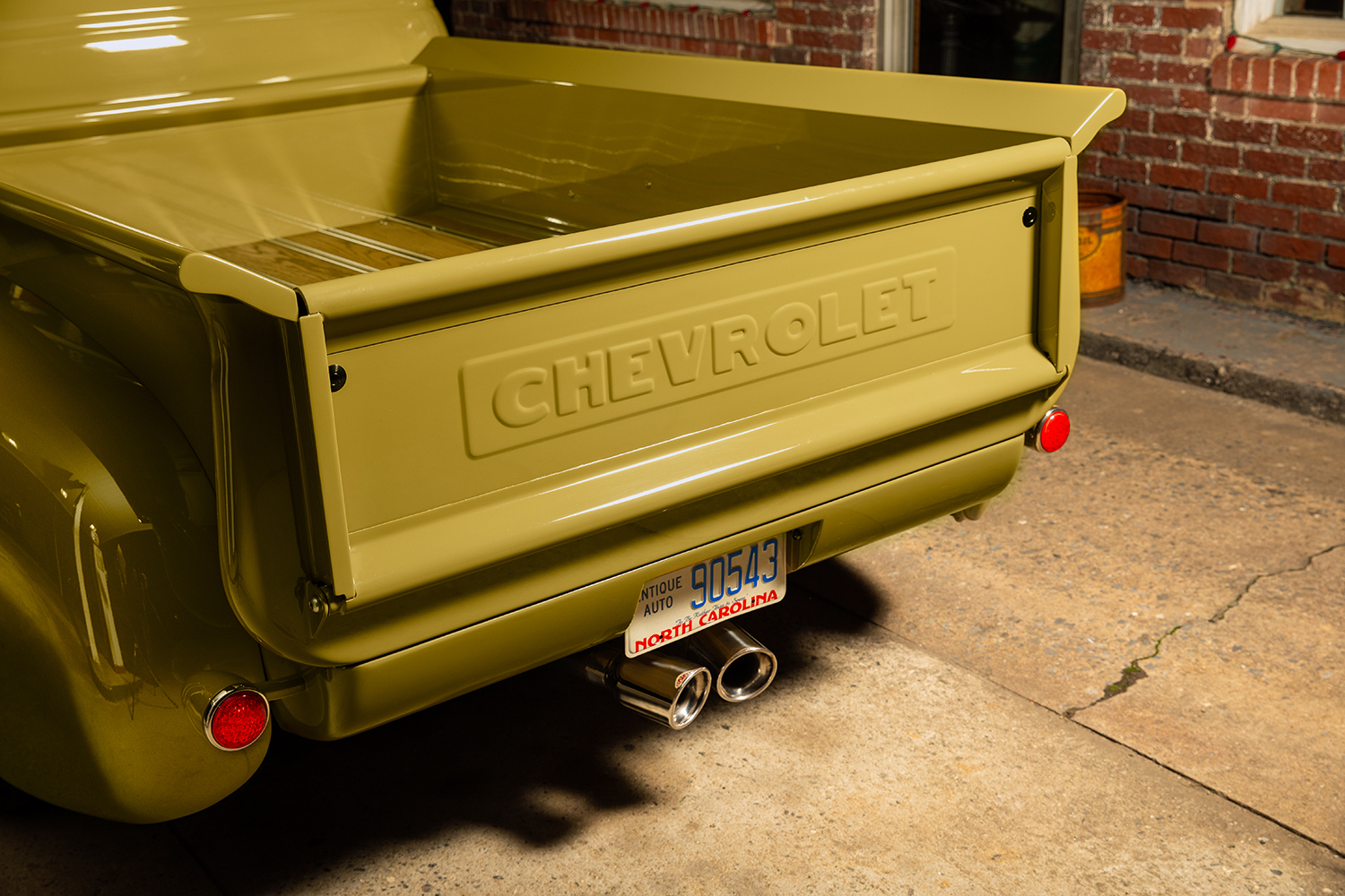 11 1952 Chevrolet 3100 tailgate with embossed Chevrolet lettering dual exhaust tips and a smooth custom finish
