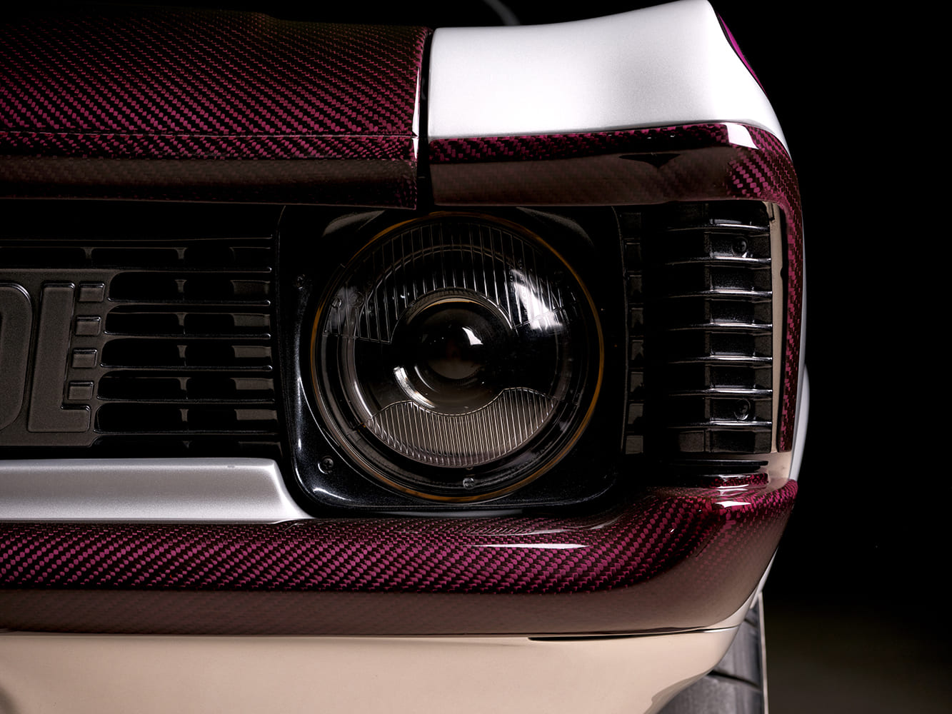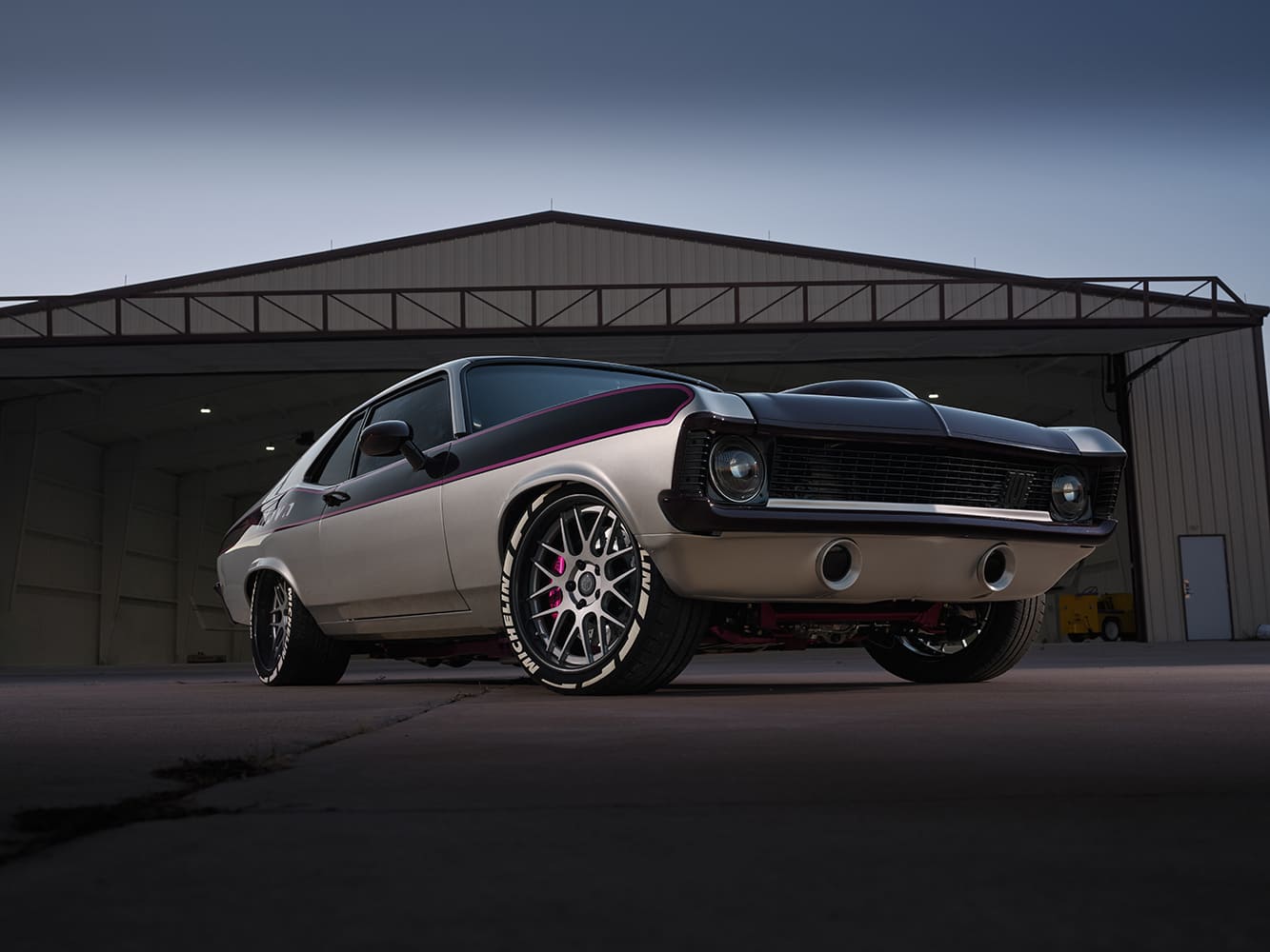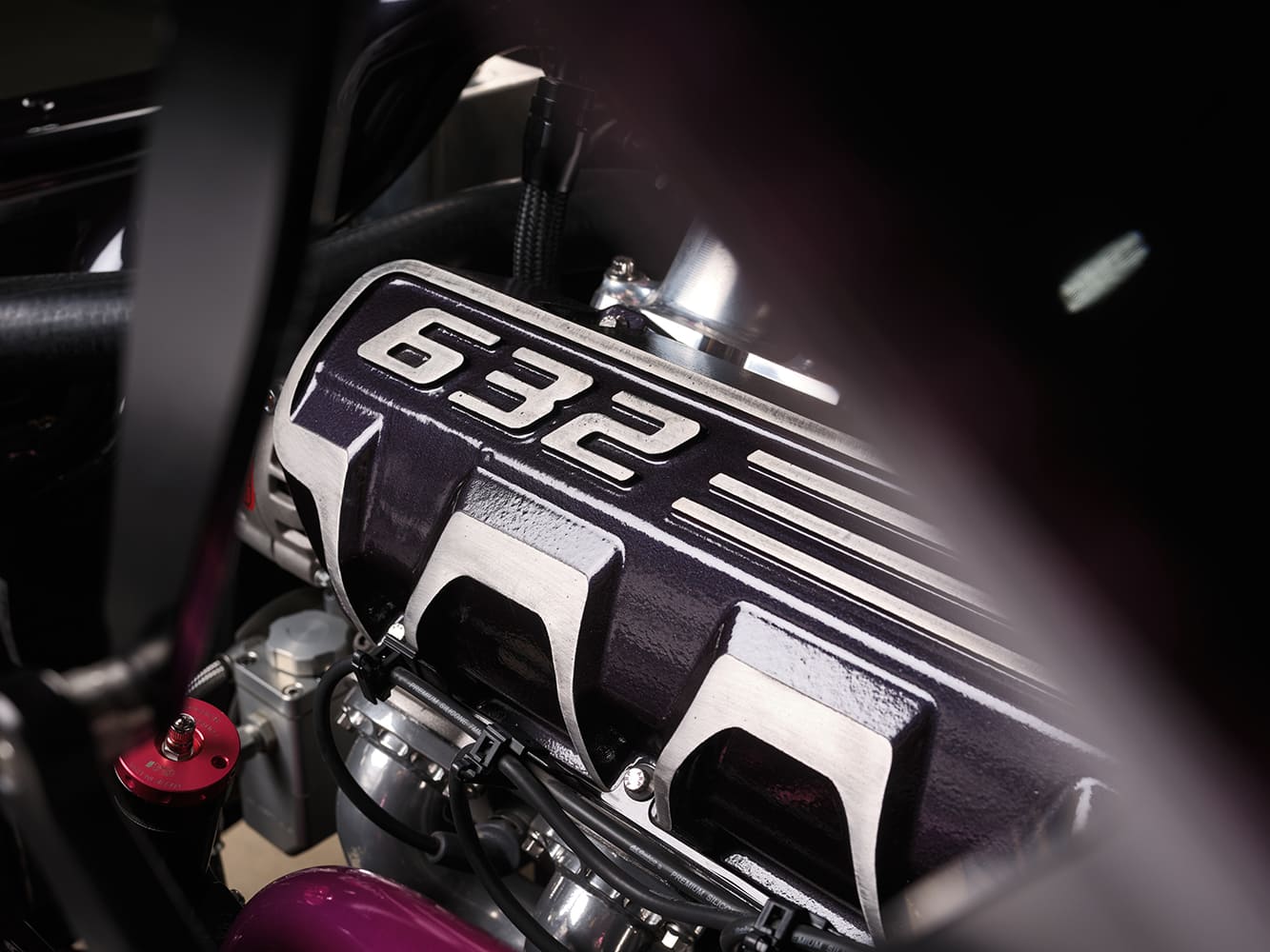 Outside, the stunning bodywork and paint were expertly performed by Red River Customs, showcasing a brilliant blend of Axalta and Tropical Glitz finished in Switchblade Silver, Royal Amathist, and Sparkling Berry, once again tying in the color scheme of Muldowney’s unmistakable dragsters. The custom carbon-fiber hood, grille, and bumpers add a sleek, lightweight edge to the build. Anvil Auto door handles enhance the modern aesthetic, while Bangin Headlights provide a bold front end look. Retaining plenty of originality, the car keeps its classic stock taillights for a perfect balance of old and new.