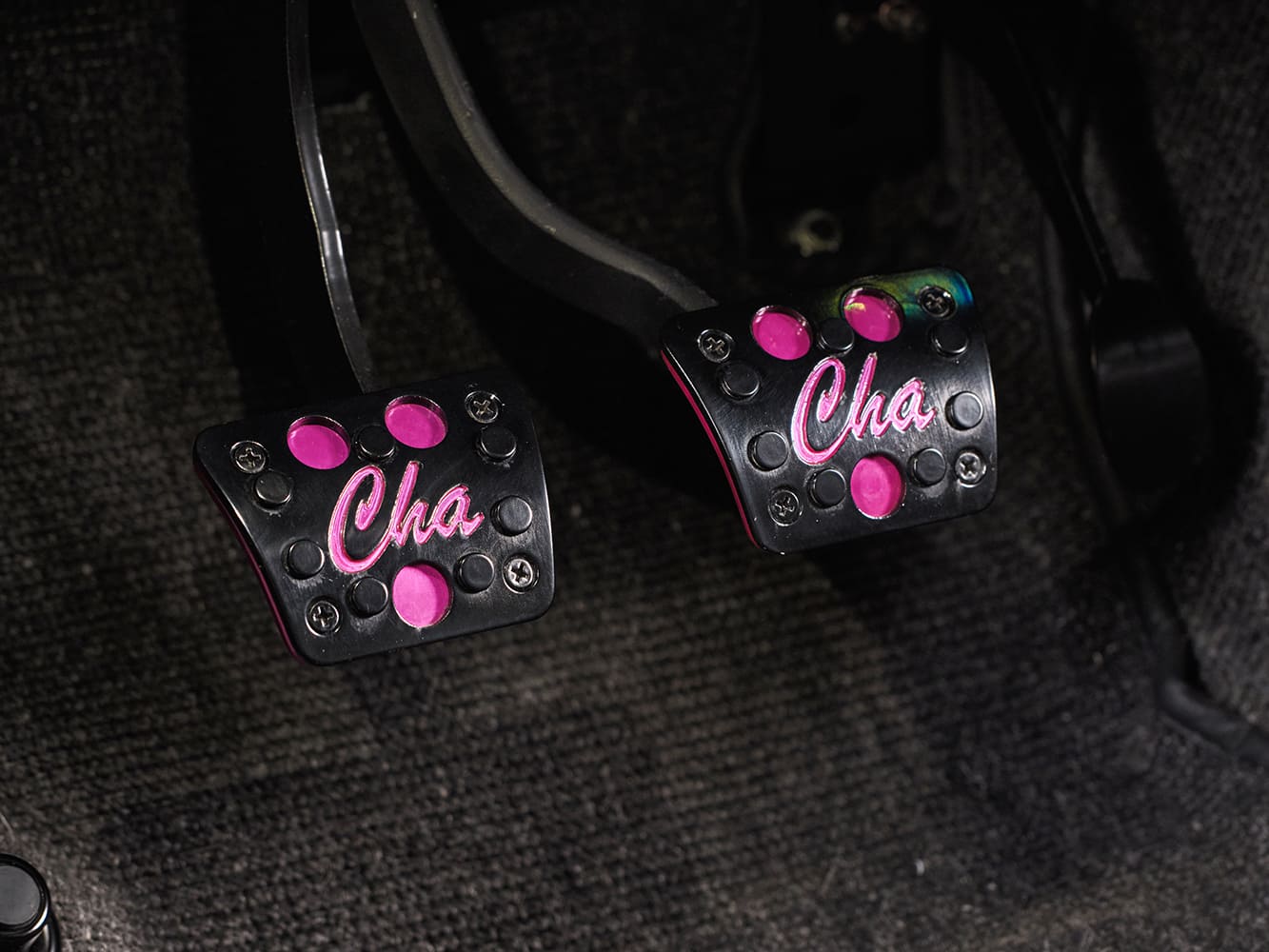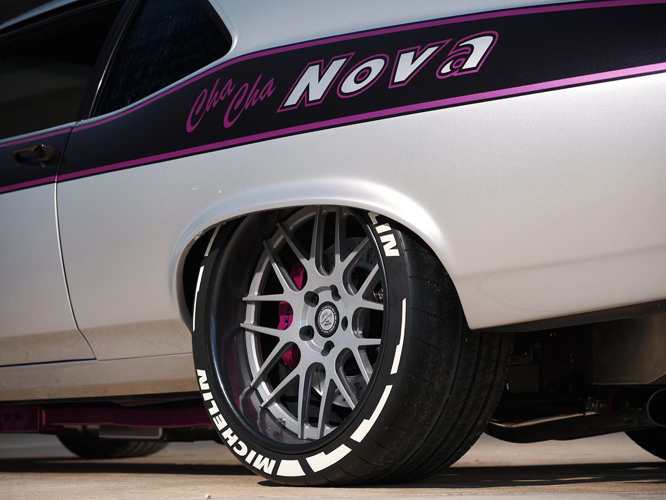 Baer 14-inch rotors and pink six-piston calipers reside on all four corners and peek through a set of Forgeline DE3C wheels customized with Shirley Muldowney center caps. The ensemble is wrapped in Michelin Sport Cup 2 rubber to complement the upgraded suspension in straight line or lateral situations.