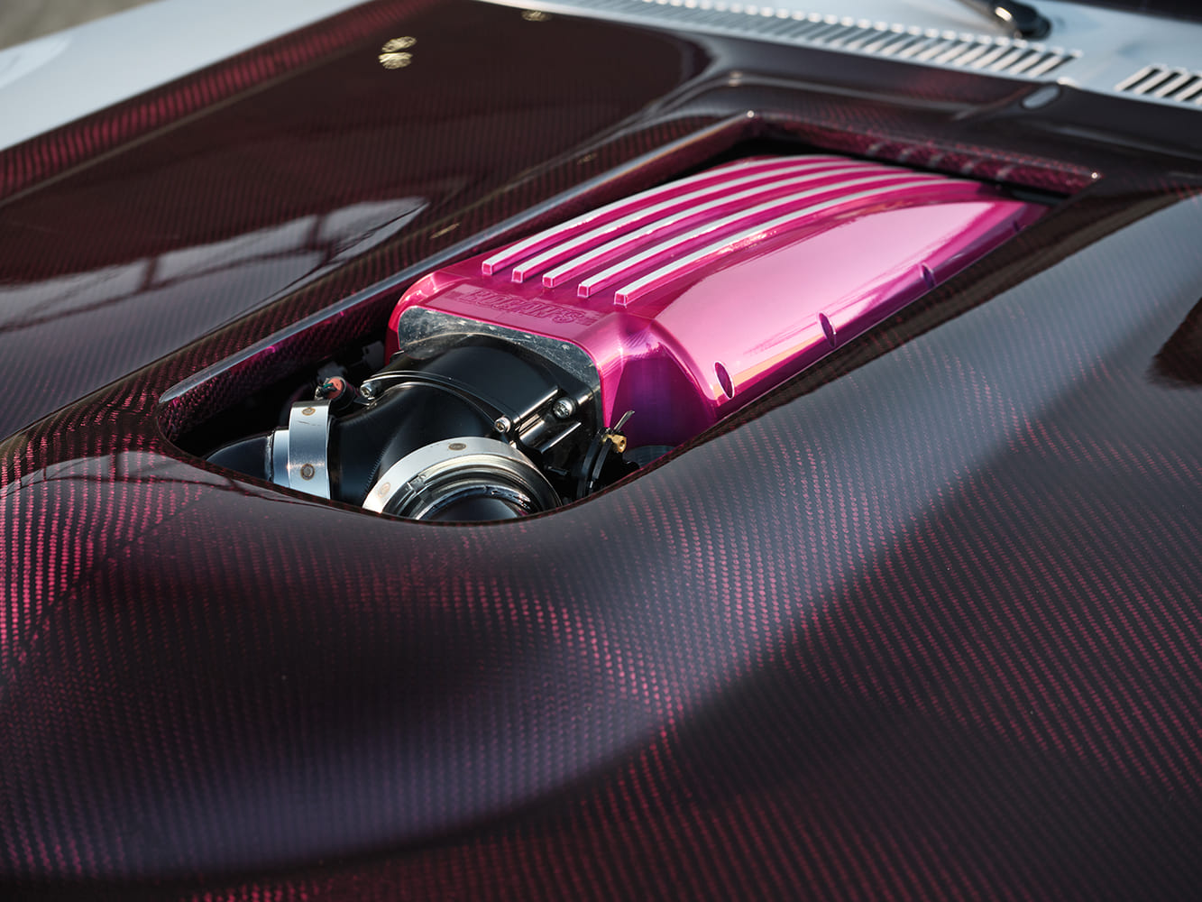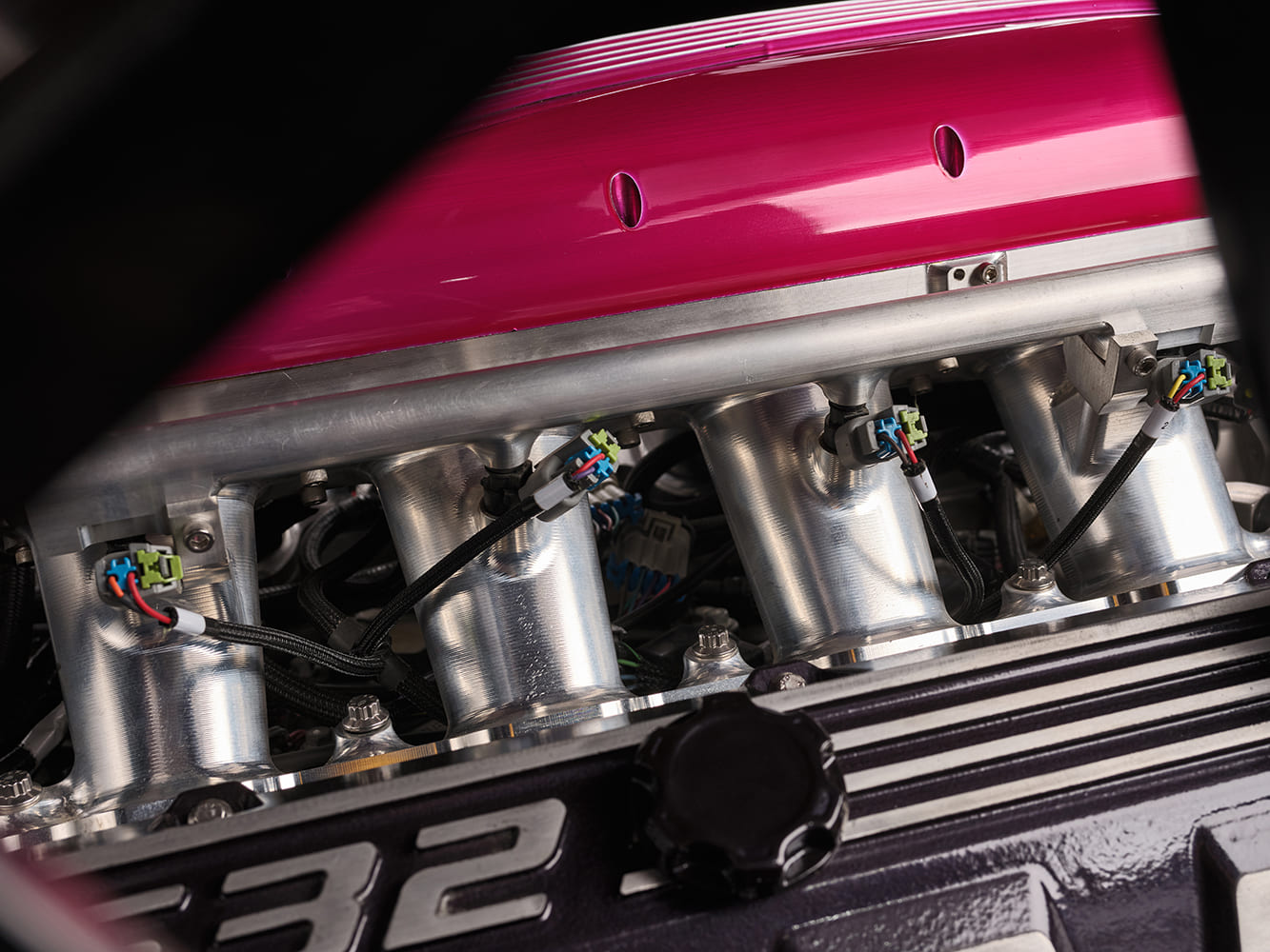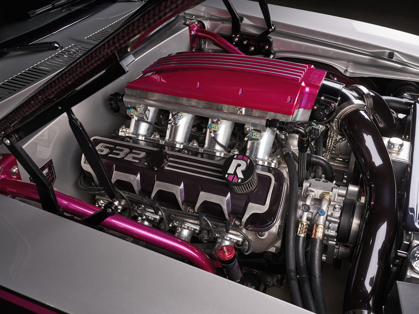 Complying with Muldowney’s request for big horsepower, underhood lies the mighty Chevrolet Performance 632ci big-block rated at just over 1,000 hp. To give the engine some additional flair, the Red River crew garnished the Hogan’s Racing Manifold in pink, paying homage to Muldowney’s legacy of racing pink dragsters. They followed up by laying down another layer of pink on the carbon-fiber inner fenders, creating an attractive home for the burley engine.