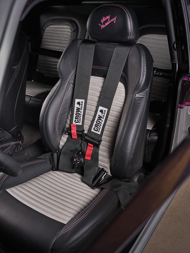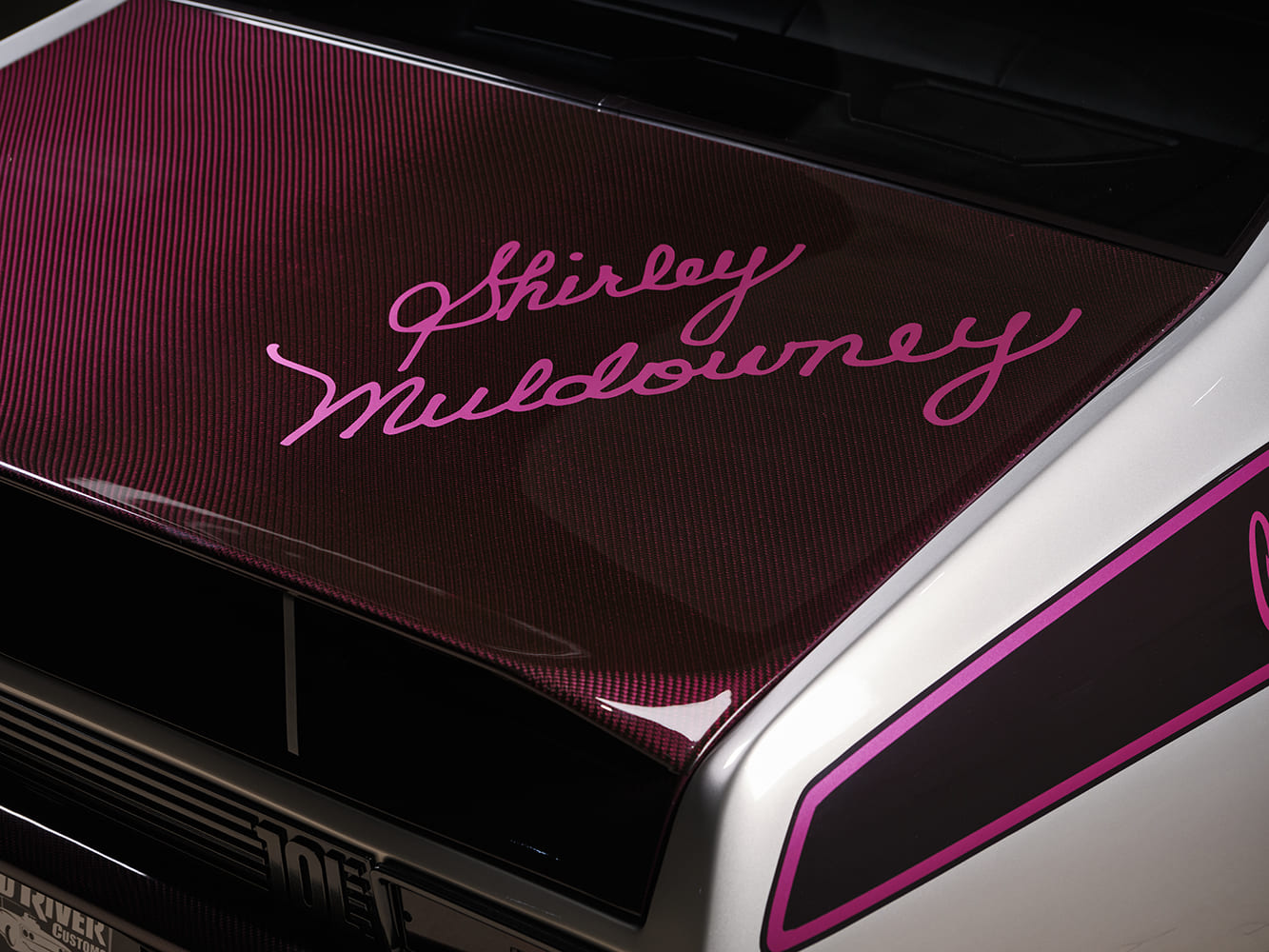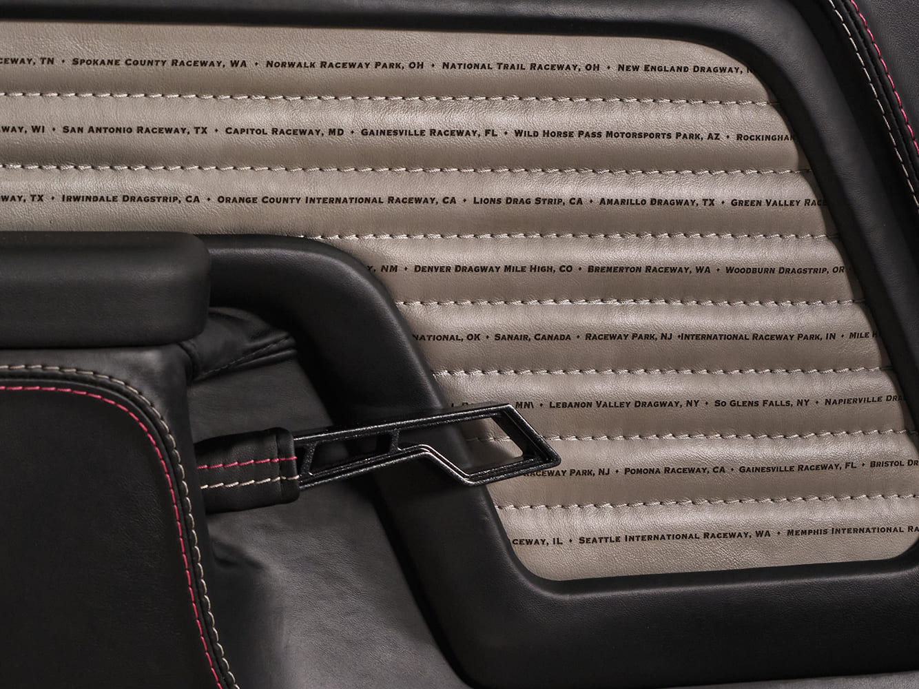 Inside, Paul-G Custom Interiors and Red River collaborated on an interior that pays homage to Muldowney’s legendary racing career by embedding the leather seat and door inserts listing every dragstrip Muldowney left her mark.