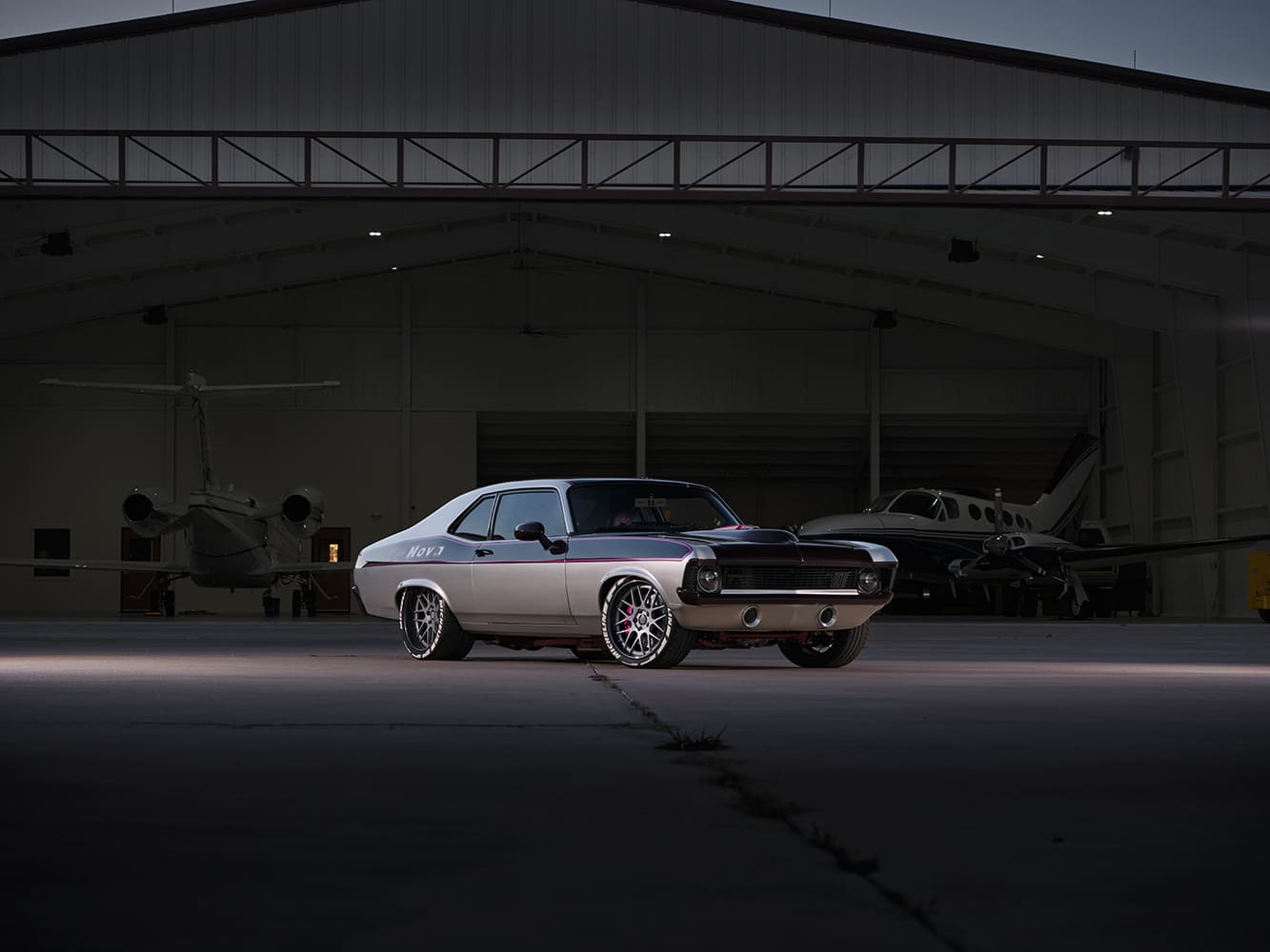 A Speedtech Performance suspension system was chosen to manage the car’s immense horsepower while delivering a versatile driving experience—capable of excelling on the dragstrip, handling hard cornering with ease, and maintaining smooth, street-friendly performance for everyday driving. Up front, the Speedtech ExtReme subframe features forged aircraft-grade aluminum spindles with C7 hubs, custom-valved QA1 double-adjustable coilover shocks, 550-pound springs, and 1 1/4-inch sway bar. Out back resides Speedtech’s High Mount cantilevered shock independent suspension system armed with QA1 double-adjustable shocks contributing to the Nova’s track-inspired cornering agility.