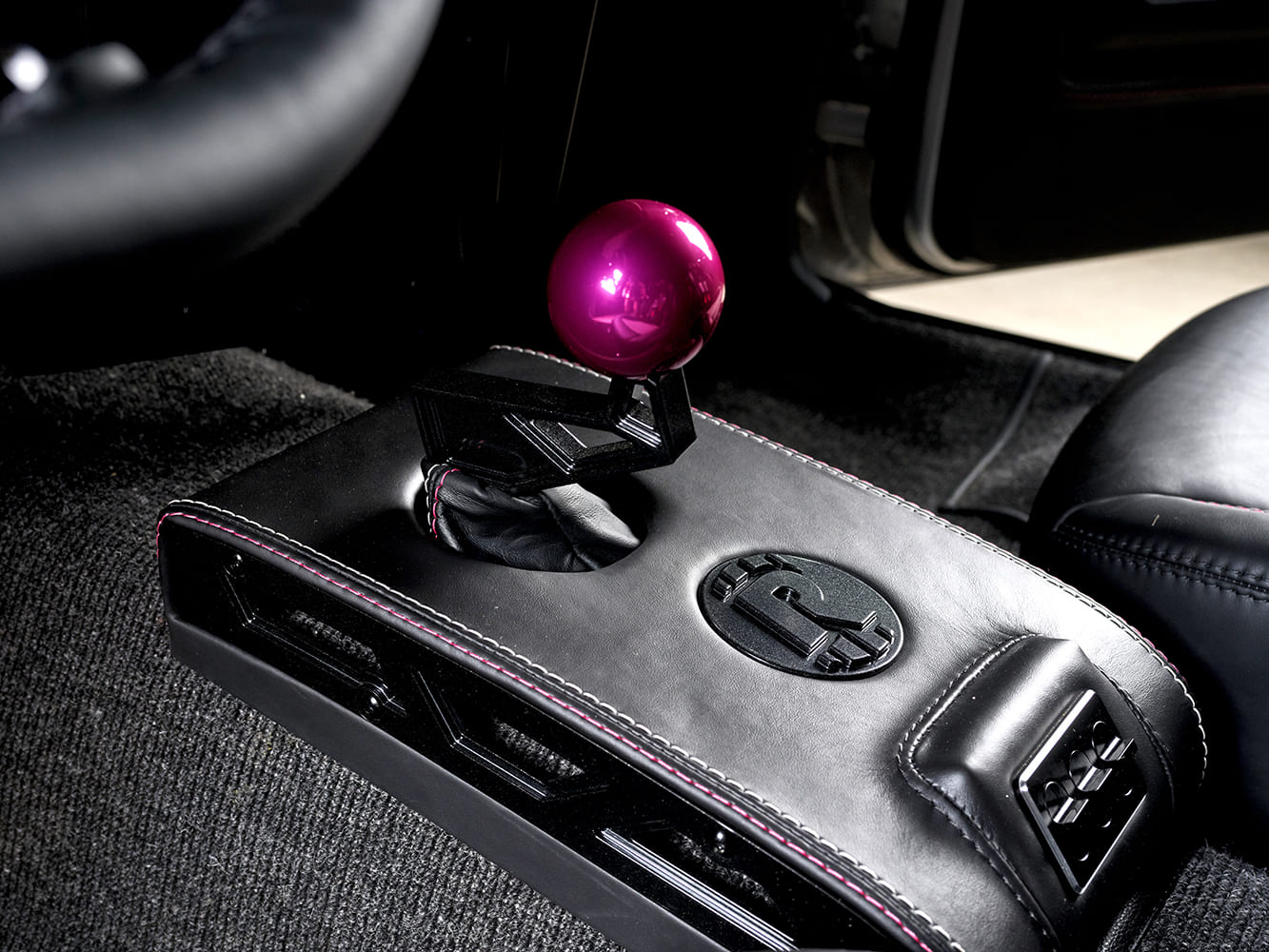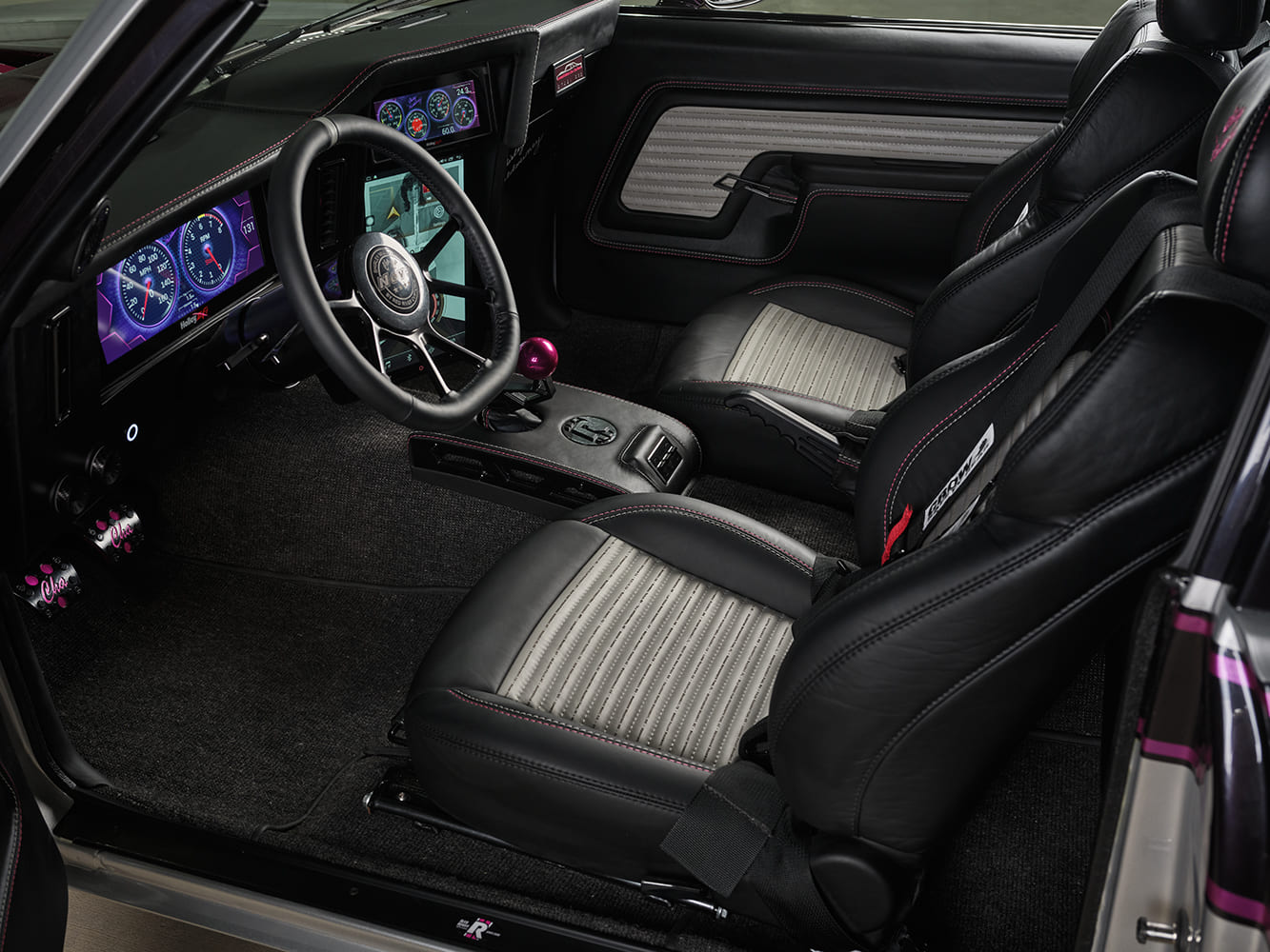 A custom Red River pink shifter resides inside the black leather-wrapped center console, and mounted in the custom dash is a Holley Pro Dash with a tailored gauge layout for real-time performance data, while a 13-inch Android screen controls the powerful Focal sound system, delivering a premium audio experience.