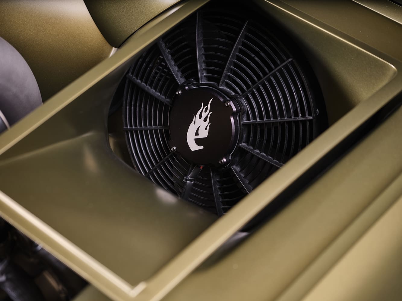 010 Custom cooling fan flame logo 1963 Corvette engine bay detail